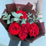 Эвкалипт – 1 шт.Лента атласная – 1 шт.Роза Freedom – 5 шт.Пленка матовая – 1 шт.