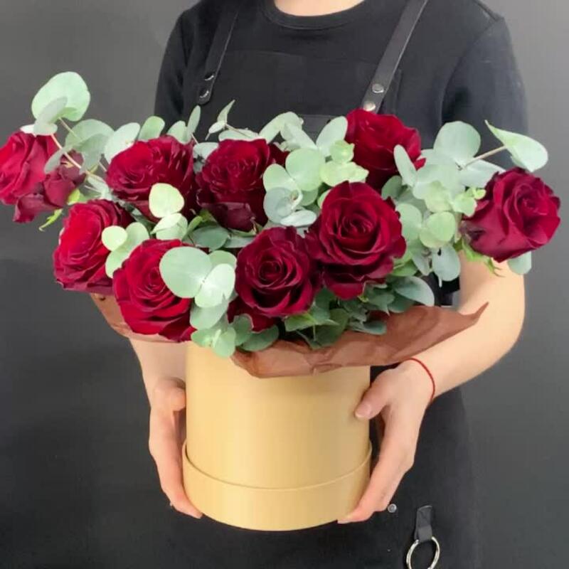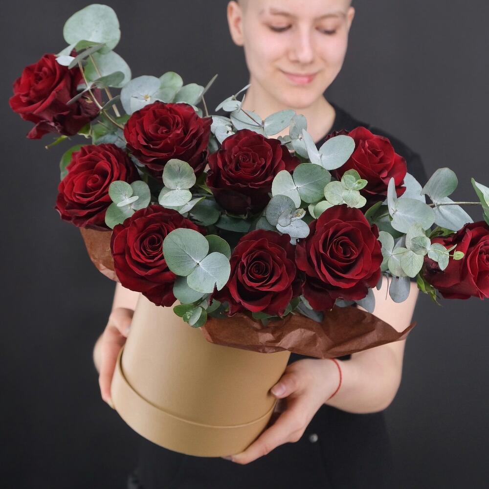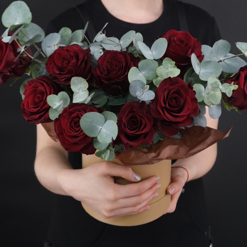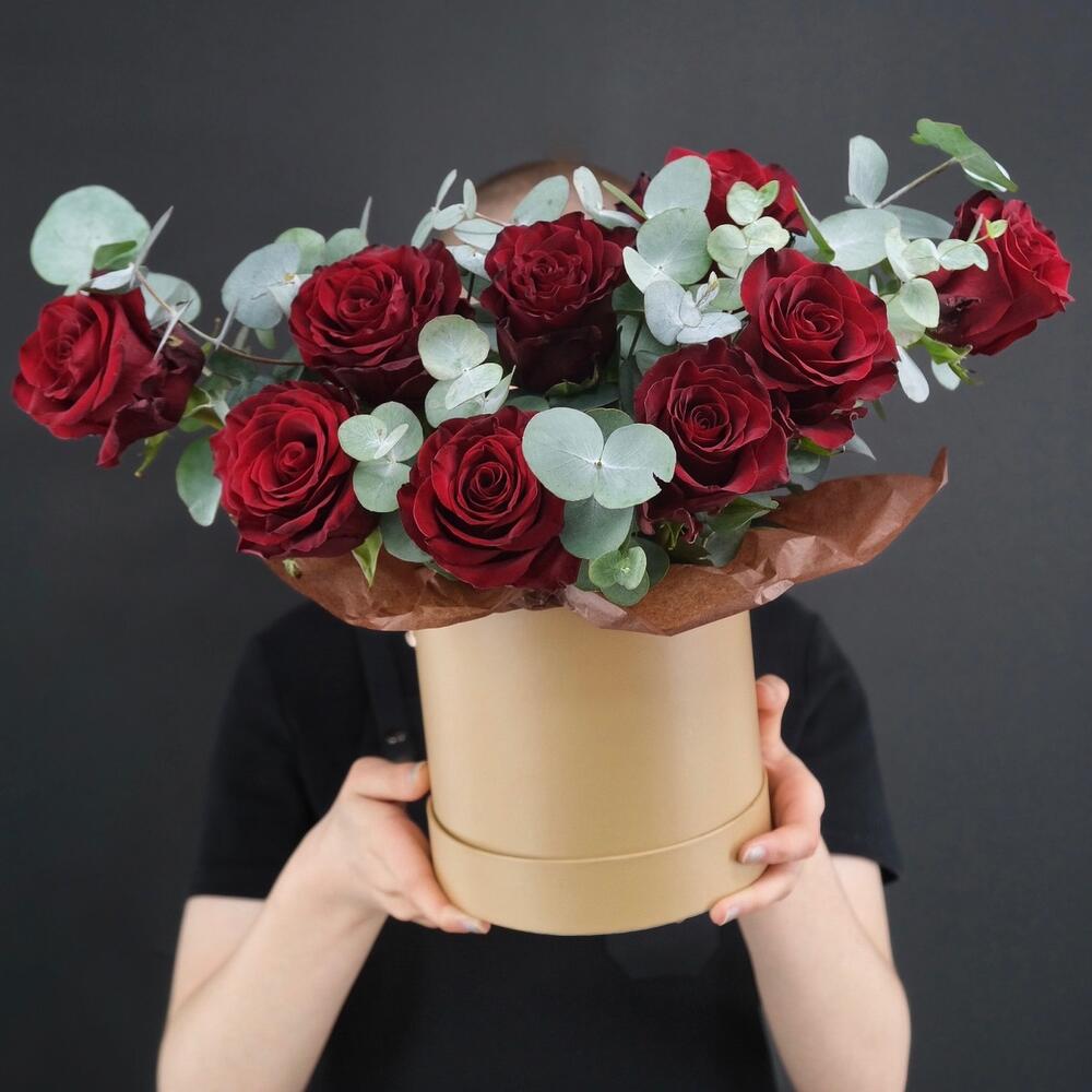 Красные розы с эвкалиптом в шляпной коробке