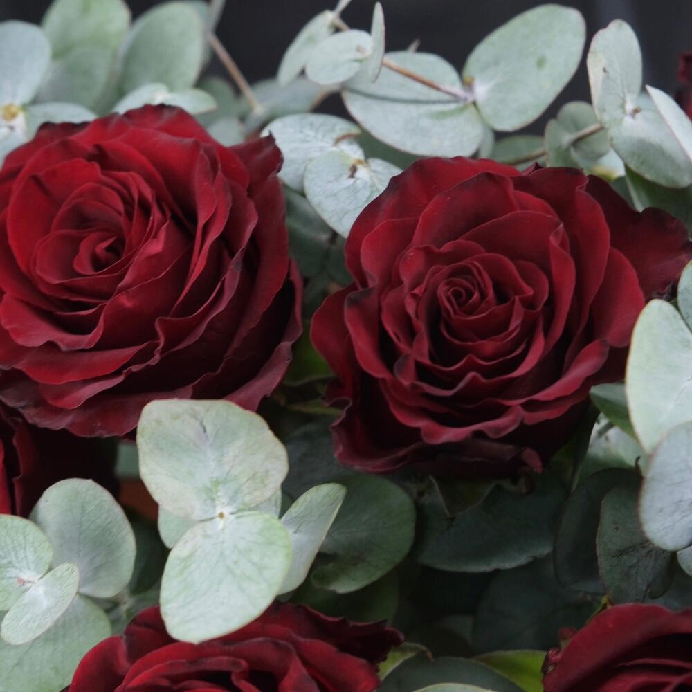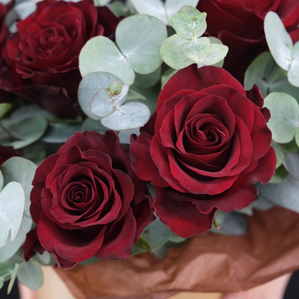 Красные розы с эвкалиптом в стильной упаковке