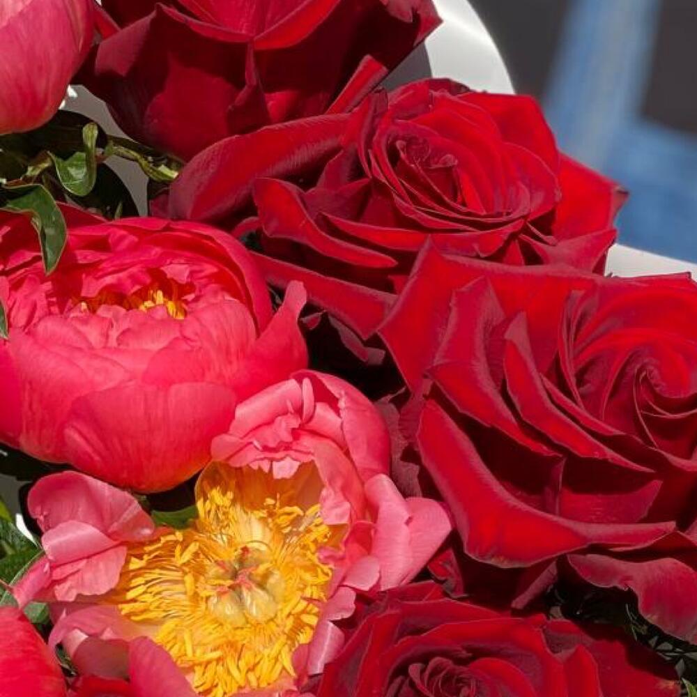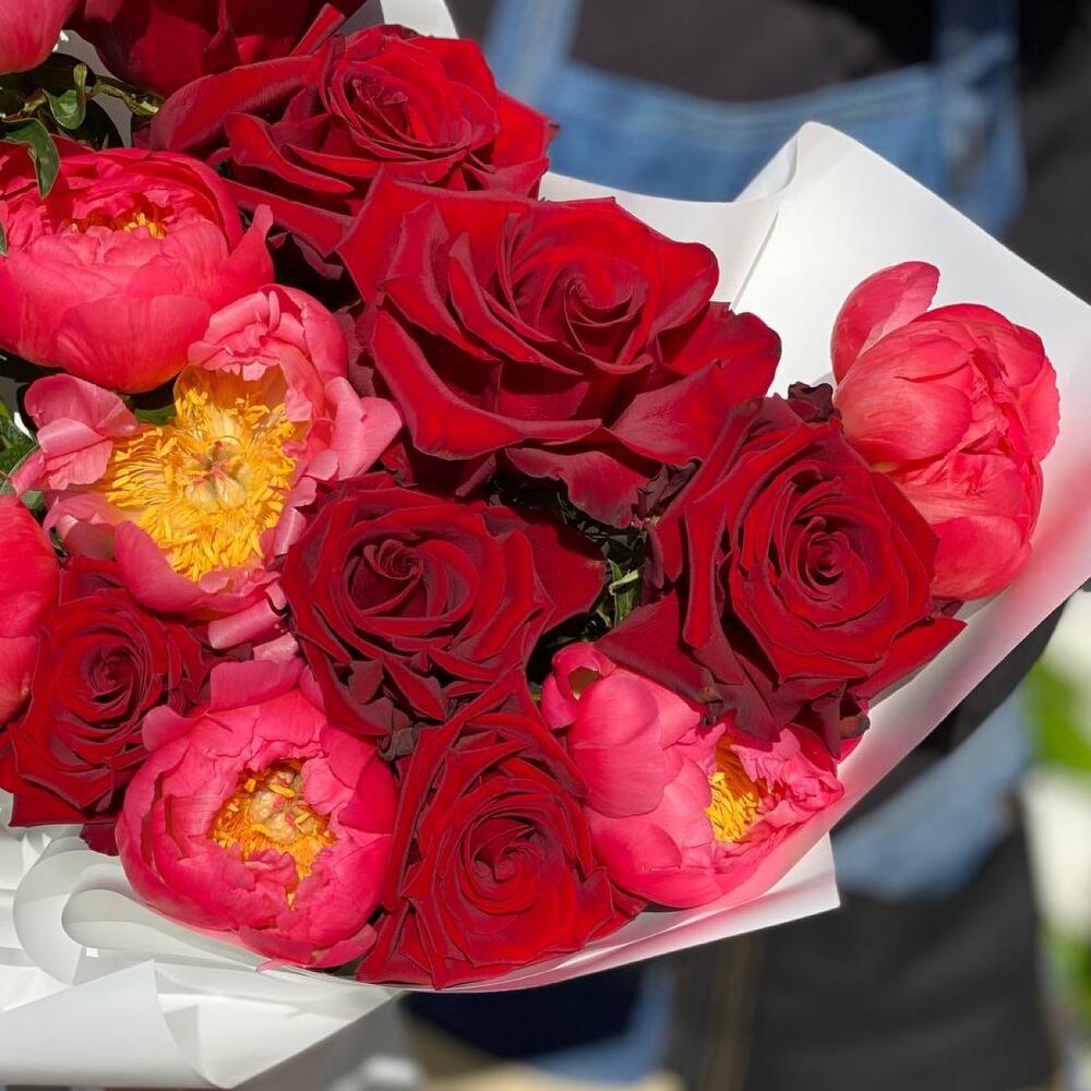Крупный Яркий букет из пионов и роз