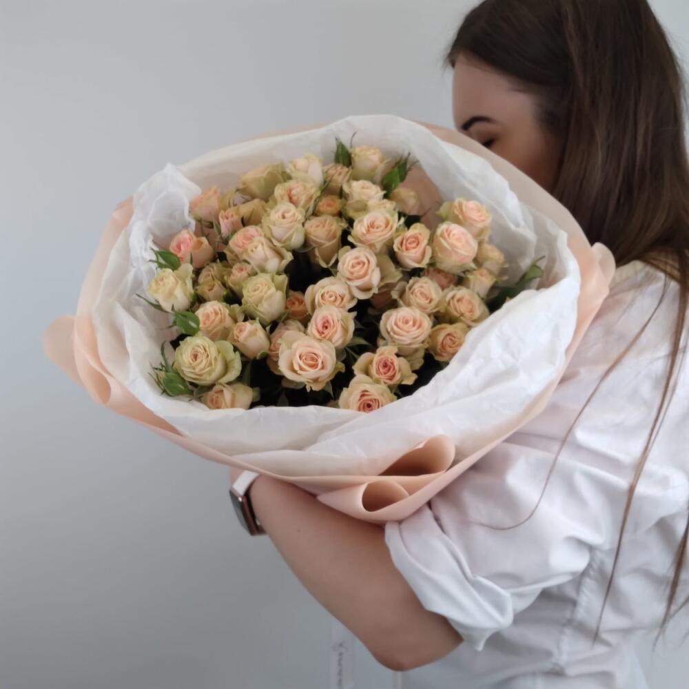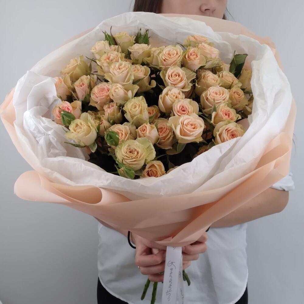 Кустовая роза – 9 шт.Тишью – 3 шт.Упаковка дизайнерская – 1 шт.