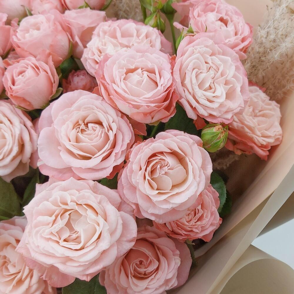 пионовидные кустовые розы – 9 шт. пампасная трава – 3 шт. Упаковка дизайнерская – 1 шт. Открыточка с вашими пожеланиями – 1 шт. инструкция по уходу за цветами – 1 шт.