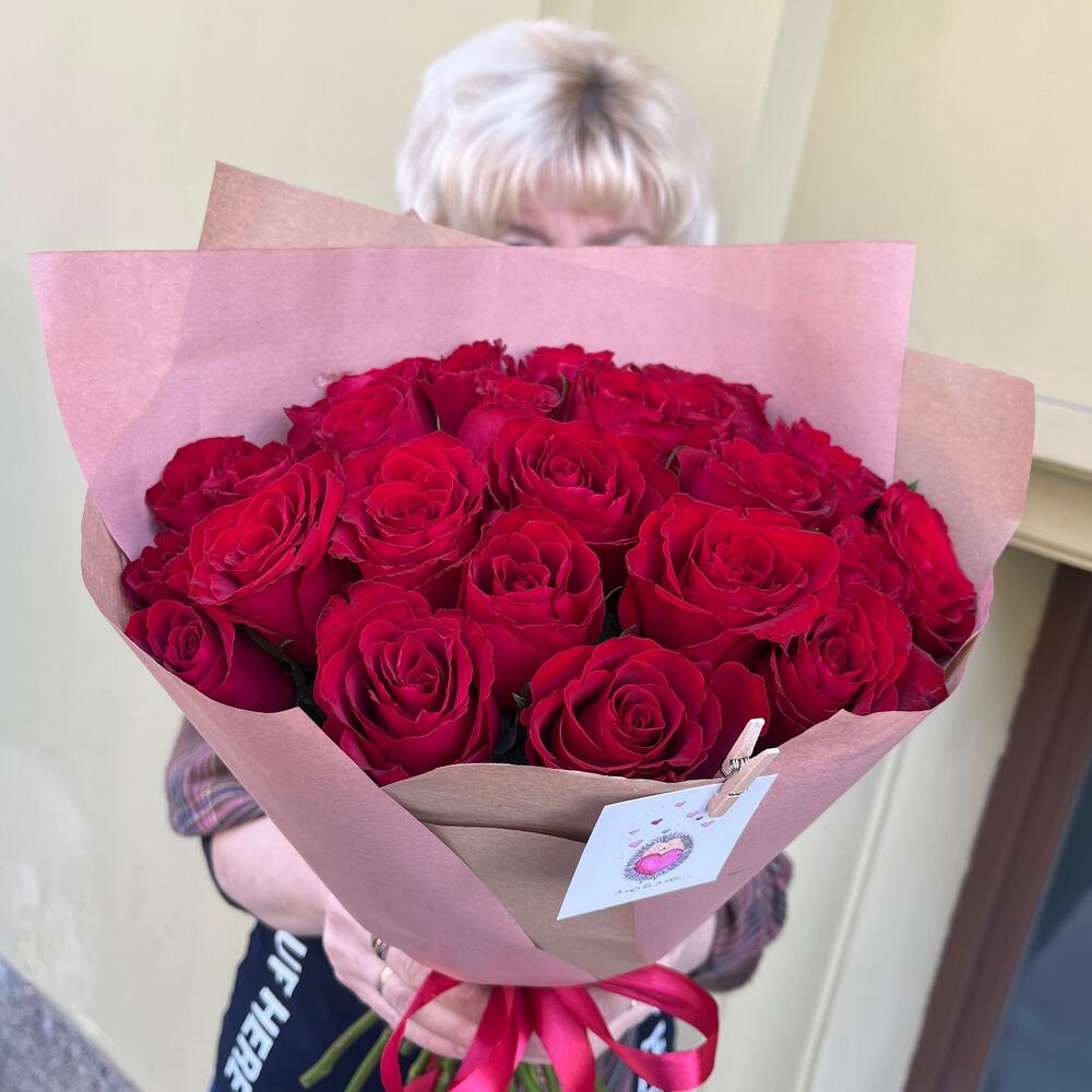 Лента атласная красная – 1 шт.бечевка – 1 шт.Упаковка крафт – 1 шт.роза кения красная 40 см – 25 шт.