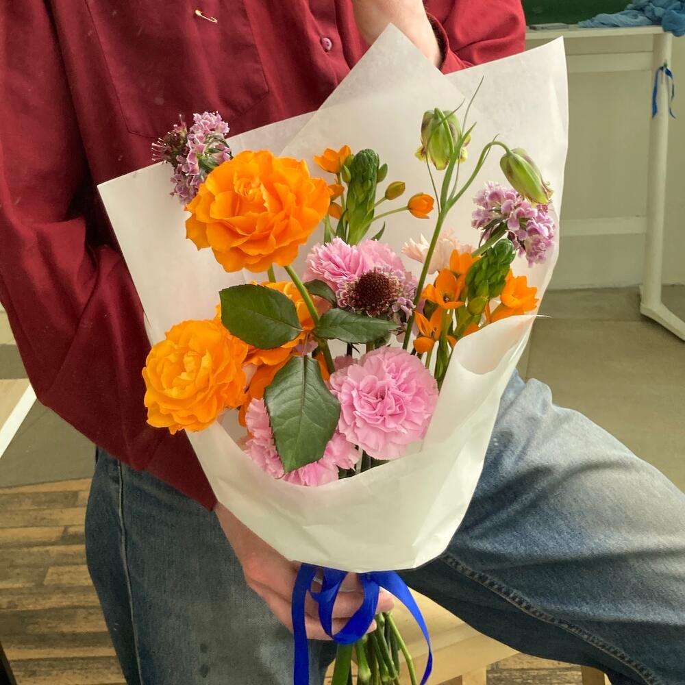Скабиоза – 3 шт.Роза – 4 шт.Гвоздика – 8 шт.Орнитогалум – 2 шт.Фритиллярия – 1 шт.
