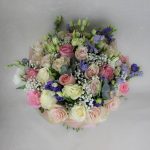 Смешанный букет из роз и гипсофилы и других цветов. Приблизительный размер 55×60.