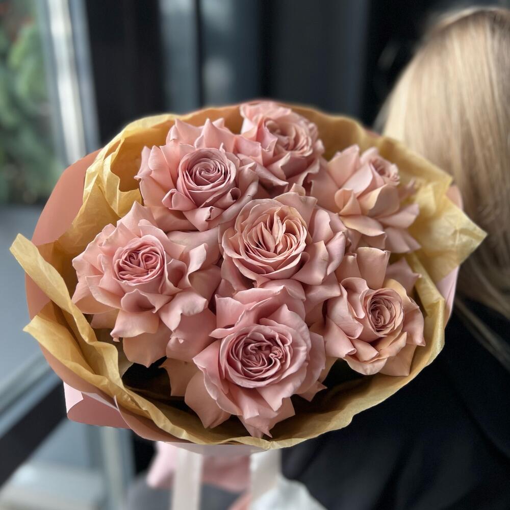 Роза пионовидная – 7 шт.Дизайнерская упаковка – 1 шт.Лента атласная – 1 шт.