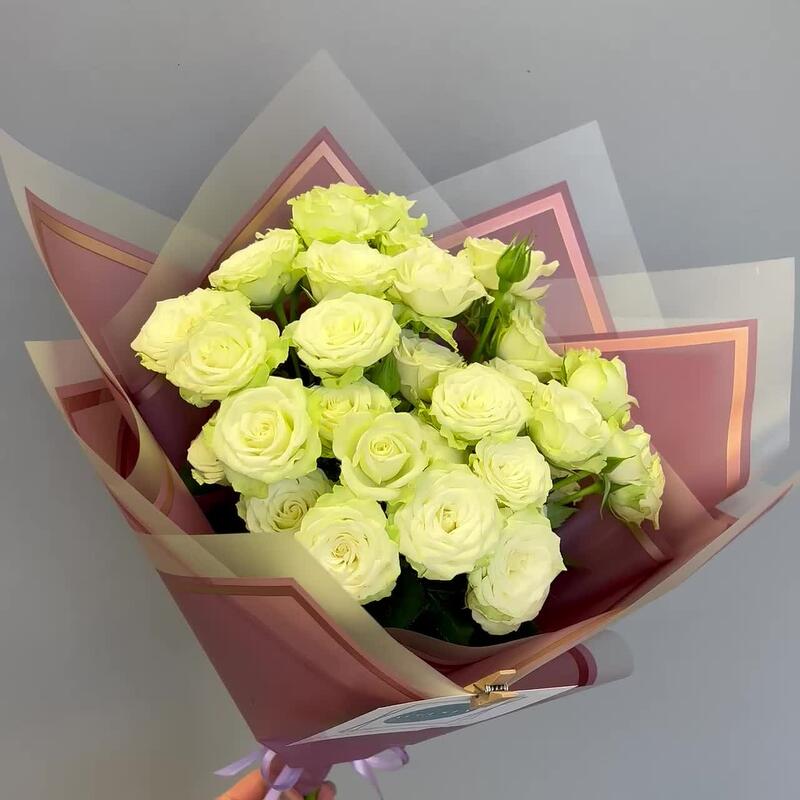 Роза кустовая – 7 шт.Упаковка дизайнерская – 1 шт.Лента атласная – 1 шт.