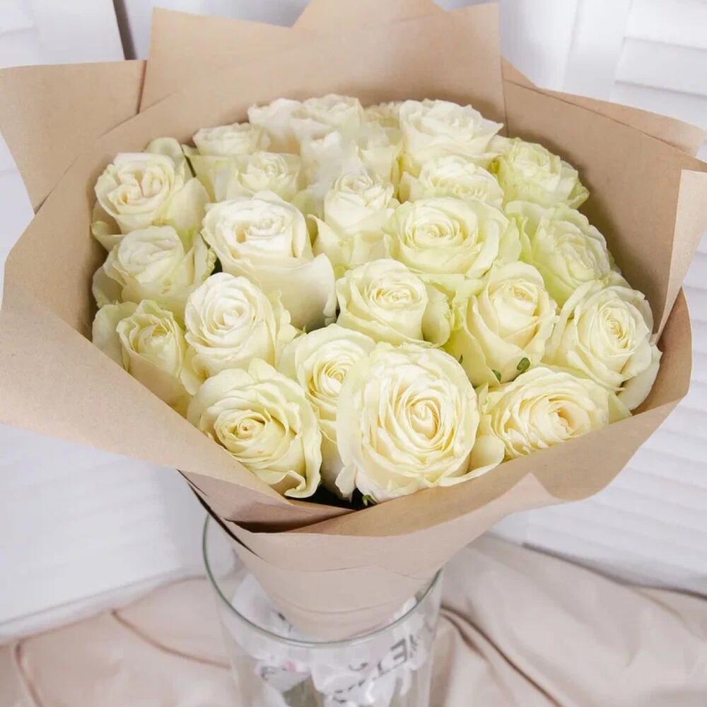 роза mondial 60 см – 25 шт.Крафт упаковка – 1 шт.Лента атласная – 1 шт.