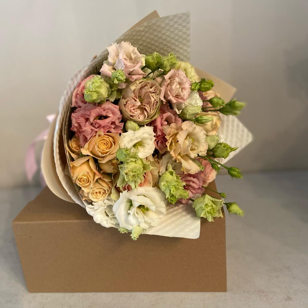 Упаковка – 1 шт.Лента атласная – 1 шт.Упаковка дизайнерская – 1 шт.крафтовая коробка – 1 шт.розы кустовые – 5 шт.розы одноголовые – 5 шт.лизтантус – 6 шт.поздравительная открытка – 1 шт.сладости микс по согласованию с клиентом – 10 шт.Открытка мини – 1 шт.