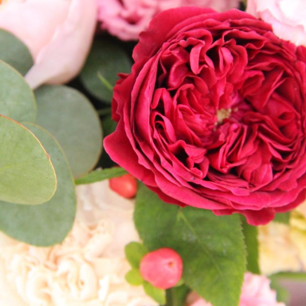 Амариллис – 2 шт.Роза пионовидная – 9 шт.Лизиантус – 9 шт.матиллла – 4 шт.Хиперикум – 2 шт.Краспедия – 2 шт.Диантус – 5 шт.Эвкалипт – 7 шт.Эвкалипт стабилизированный – 4 шт.Лента атласная – 2 шт.Лента бархат – 1 шт.