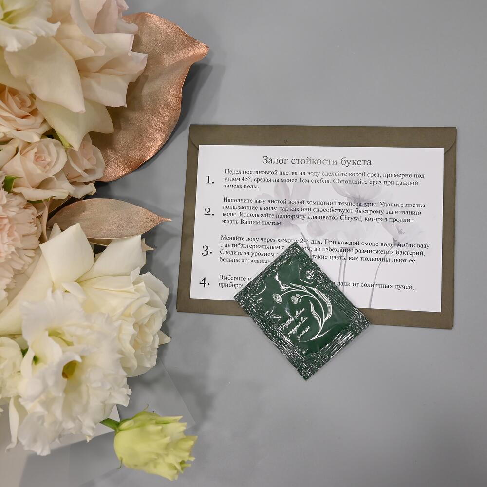 - Сроки возврата: Претензии по качеству букета принимаются в течение 24 часов с момента его получения.