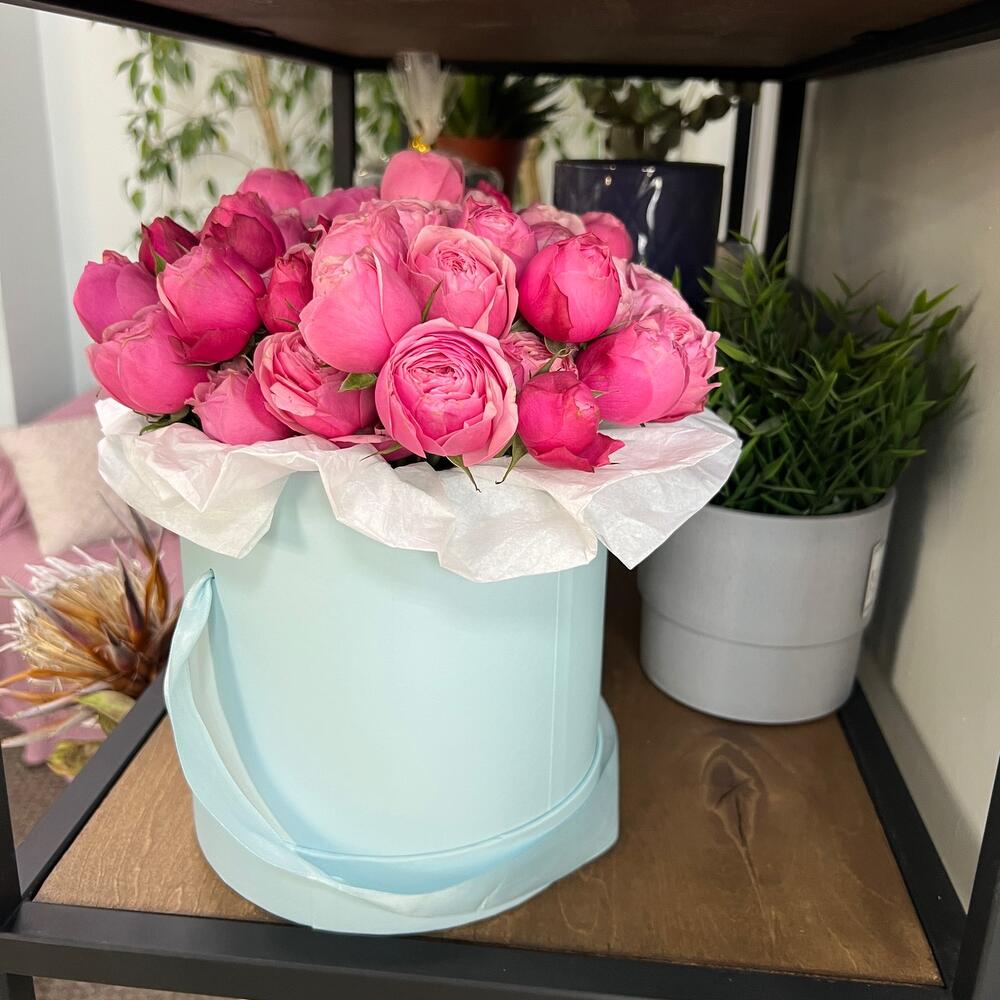 Шляпная коробка – 1 шт.Кустовая пионовидная роза – 11 шт.Тишью белое – 2 шт.аквапак с водой – 1 шт.
