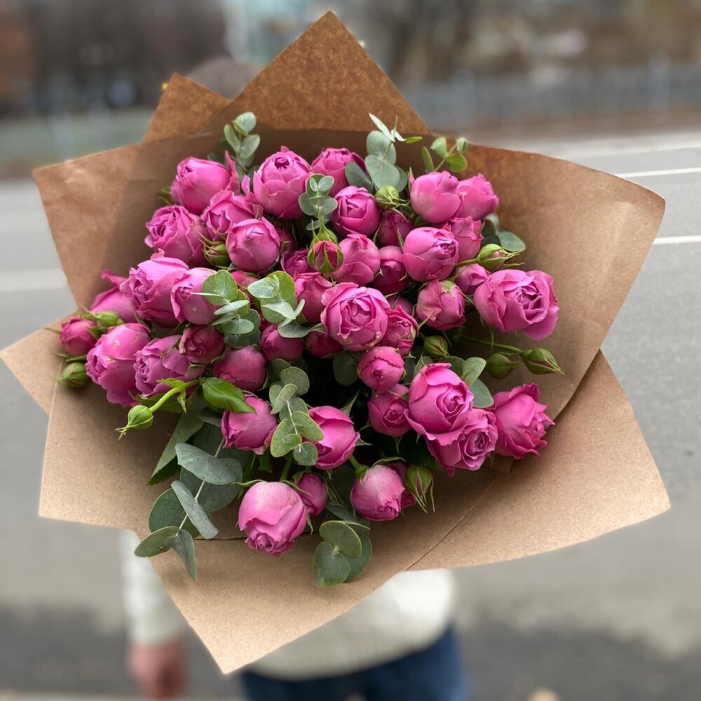 пионовидные розы Misty Bubbles – 11 шт. Эвкалипт – 3 шт. Крафт – 2 шт. Открыточка с вашими пожеланиями – 1 шт.