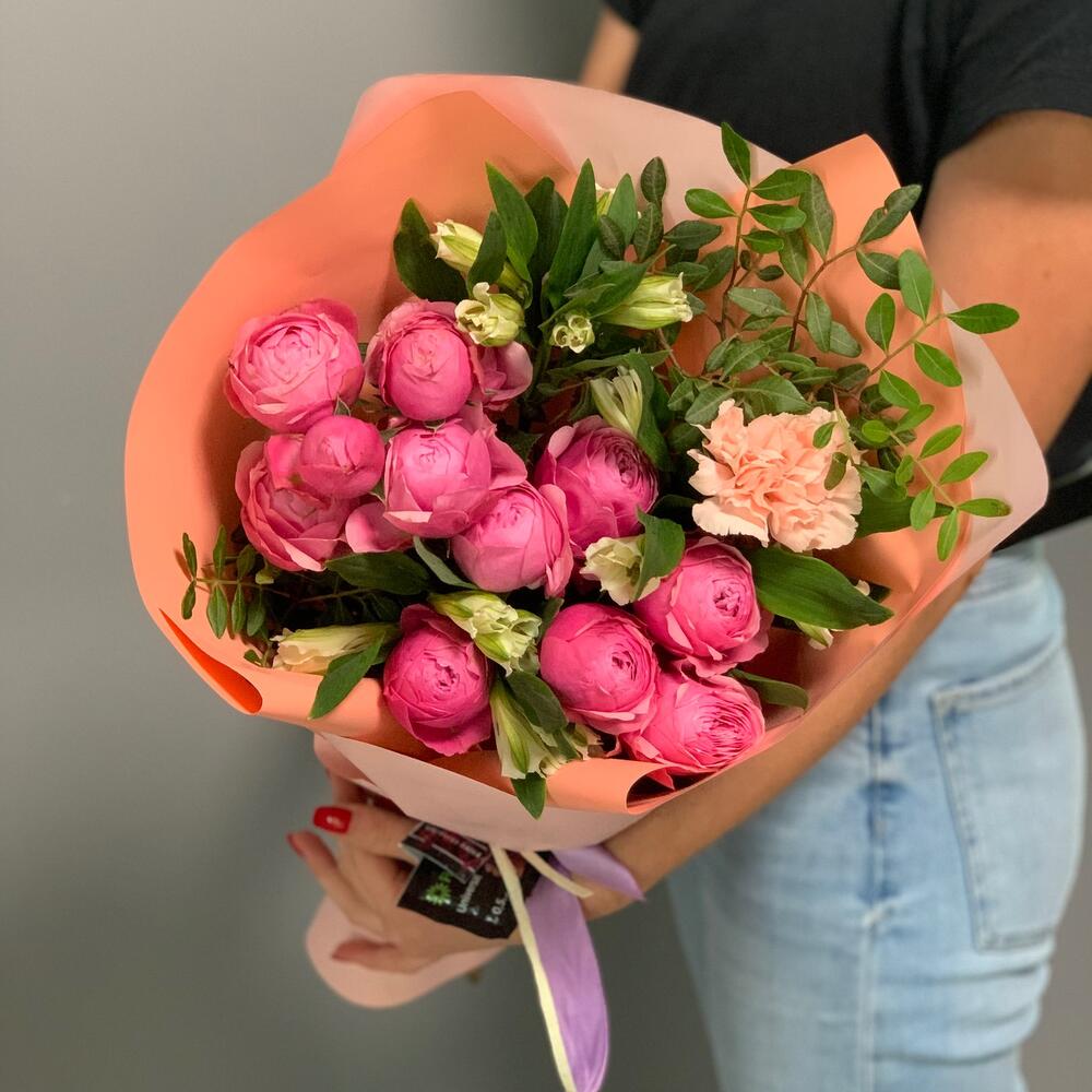 Милый приятный букет с пионовидной кустовой розой, Котора напоминает лето и Тепло, альстромерия и гвоздичка, которая стоит до 2-3 недель и писташ, освежающая букет подарят радость родному человеку для продления жизни цветочков мы добавляем кризал к букету