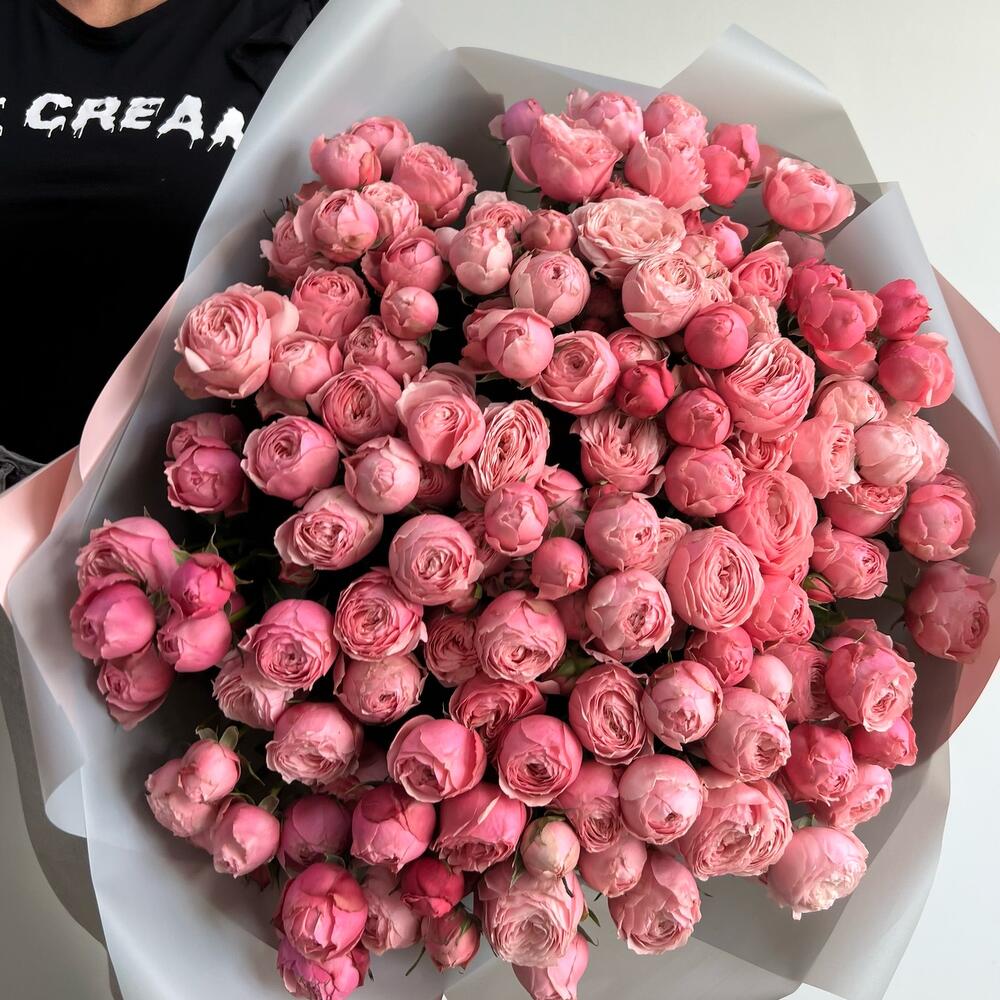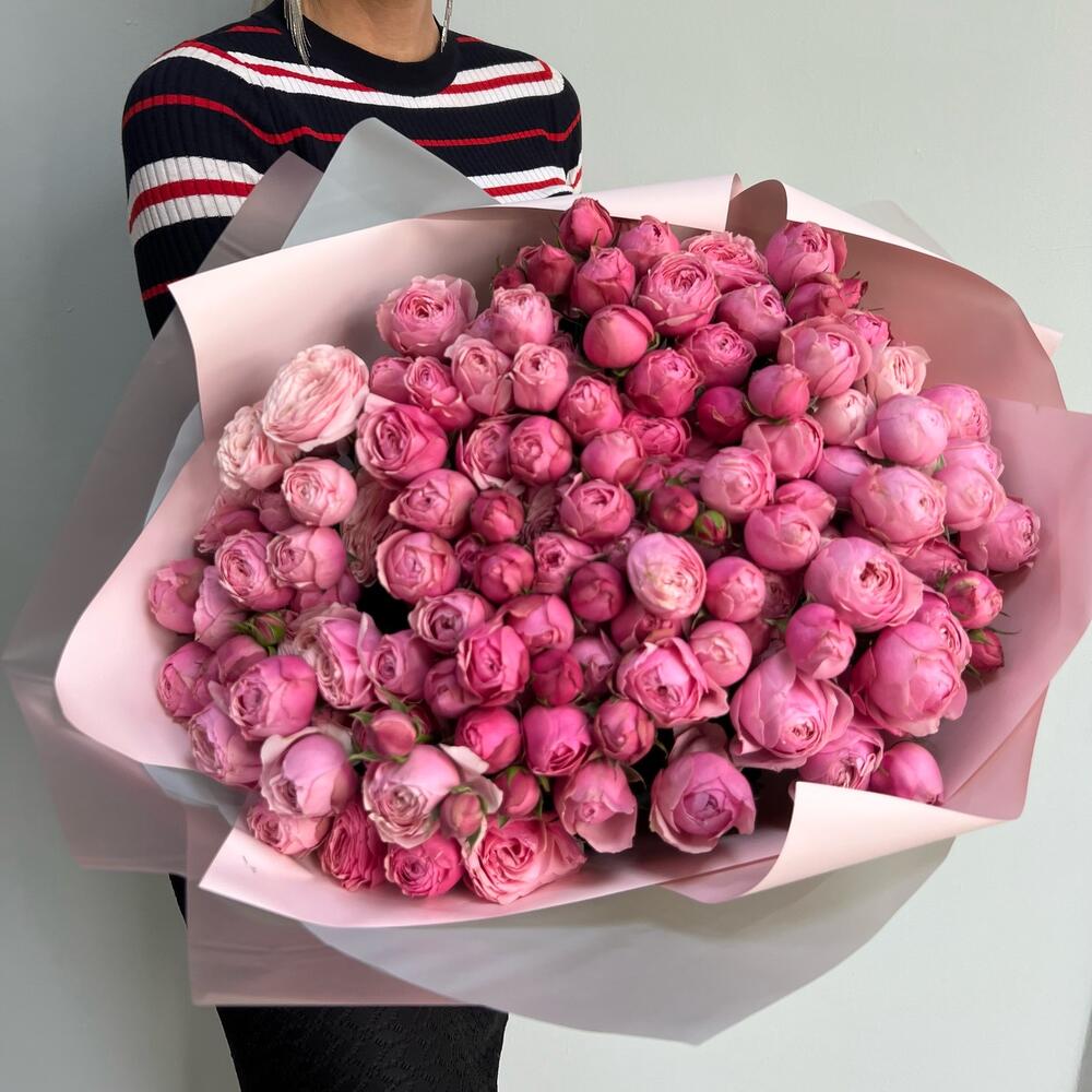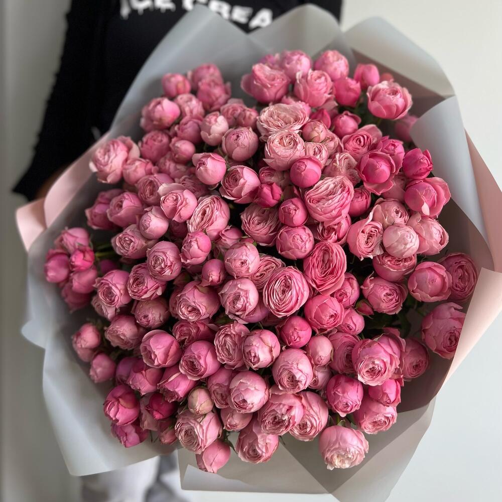 кустовая пионовидная роза сильвия пинк садовая – 25 шт.Упаковка дизайнерская – 4 шт.Лента – 1 шт.