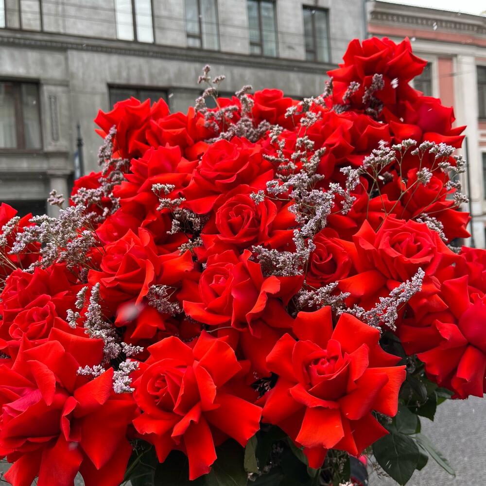 роза премиум французская рина – 35 шт.Лимониум сиреневый – 10 шт.Лента атласная – 4 шт.