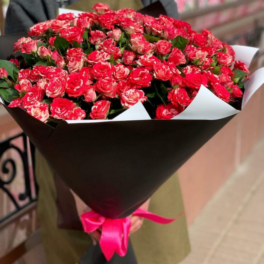 Пышный букет мраморных кустовых роз в дизайнеской упаковкеЯркие и сочные розы, долго стоят и долго радуют!) Девушки их очень часто выбирают, а значит этот букет достойный!) Дарите цветы – дарите их именно так, ведь каждая девушка, любого возраста мечтает о таком букете, … Показать ещёне говоря уже о том что крутость этого букета зашкаливает! Покоряйте и удивляйте, а мы вам в этом с удовольствием поможем!)