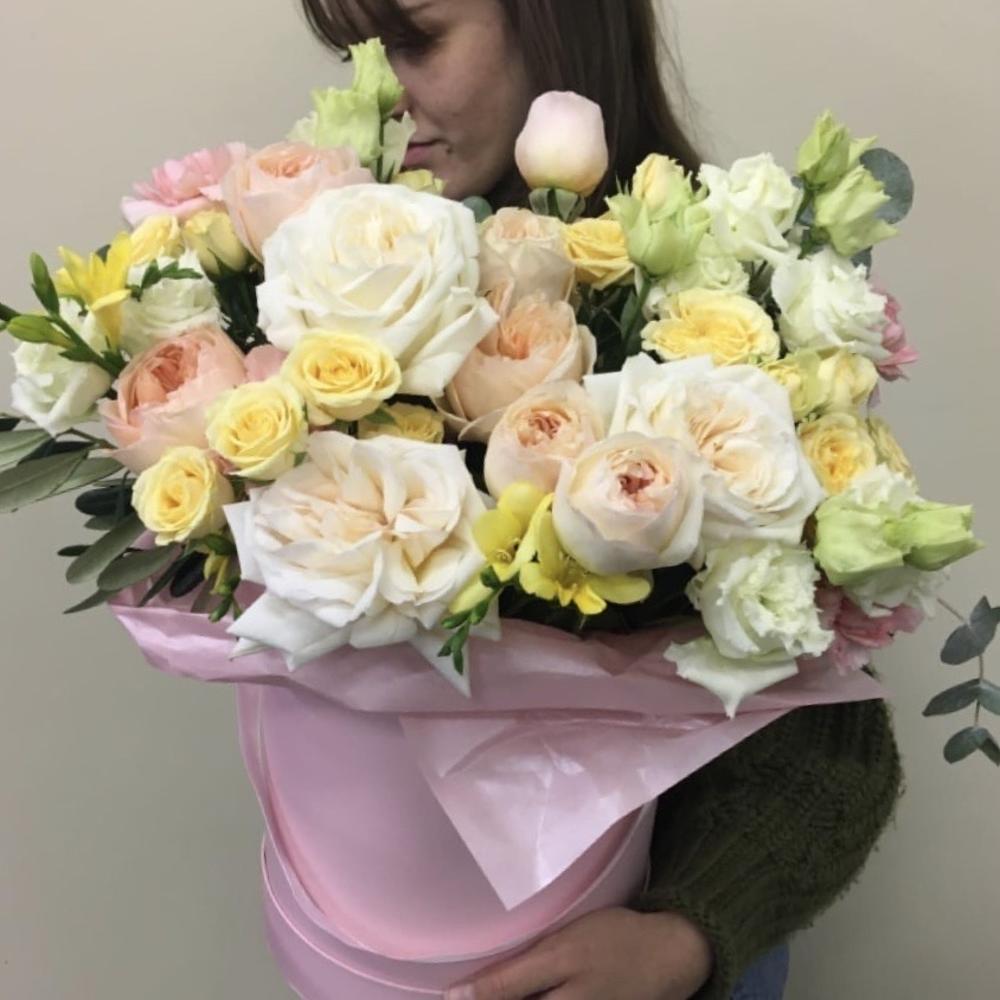 Роза пионовидная – 12 шт.Роза кустовая – 5 шт.Лизиантус – 7 шт.Фрезия – 5 шт.Эвкалипт – 9 шт.Шляпная коробка – 1 шт.Тишью – 2 шт.Оазис – 1 шт.