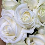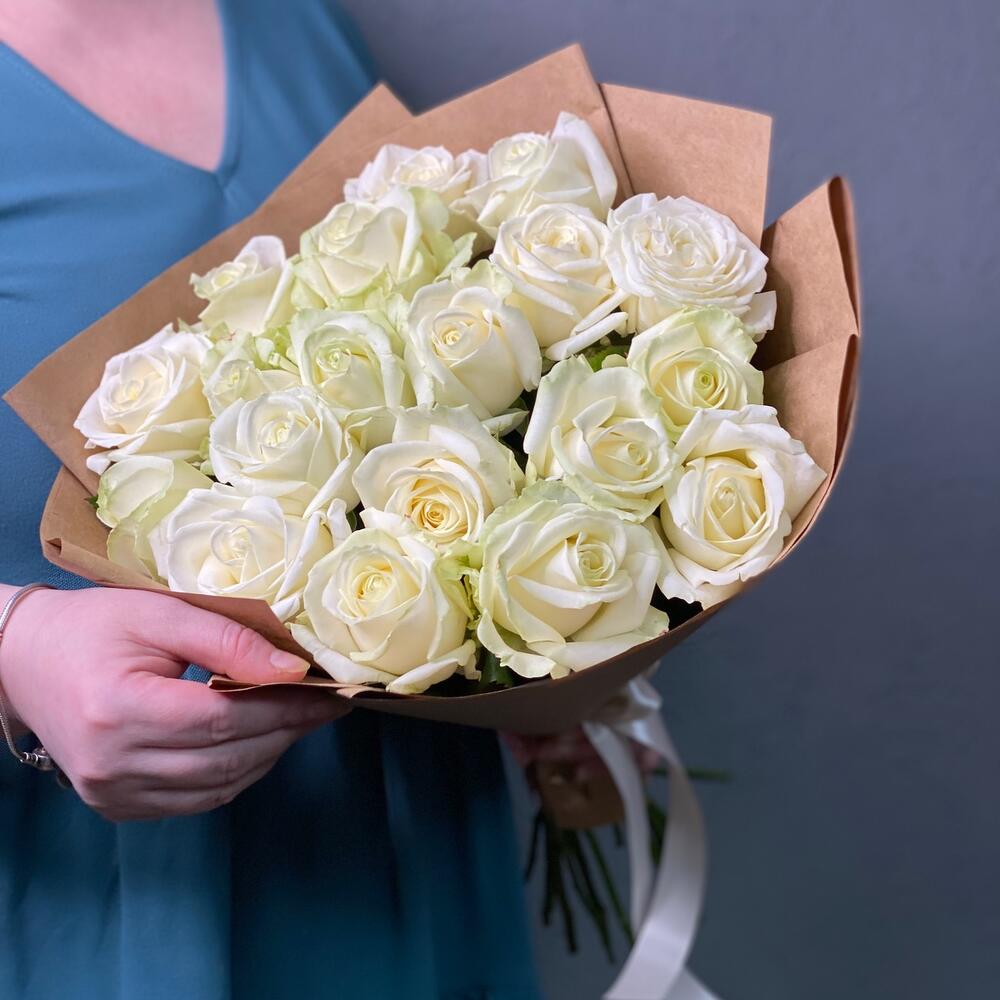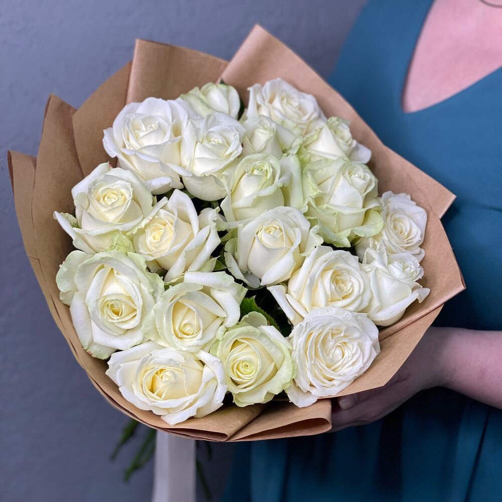 Роза белая одноголовая – 19 шт.Крафт дизайнерский – 1 шт.Лента атласная – 1 шт.