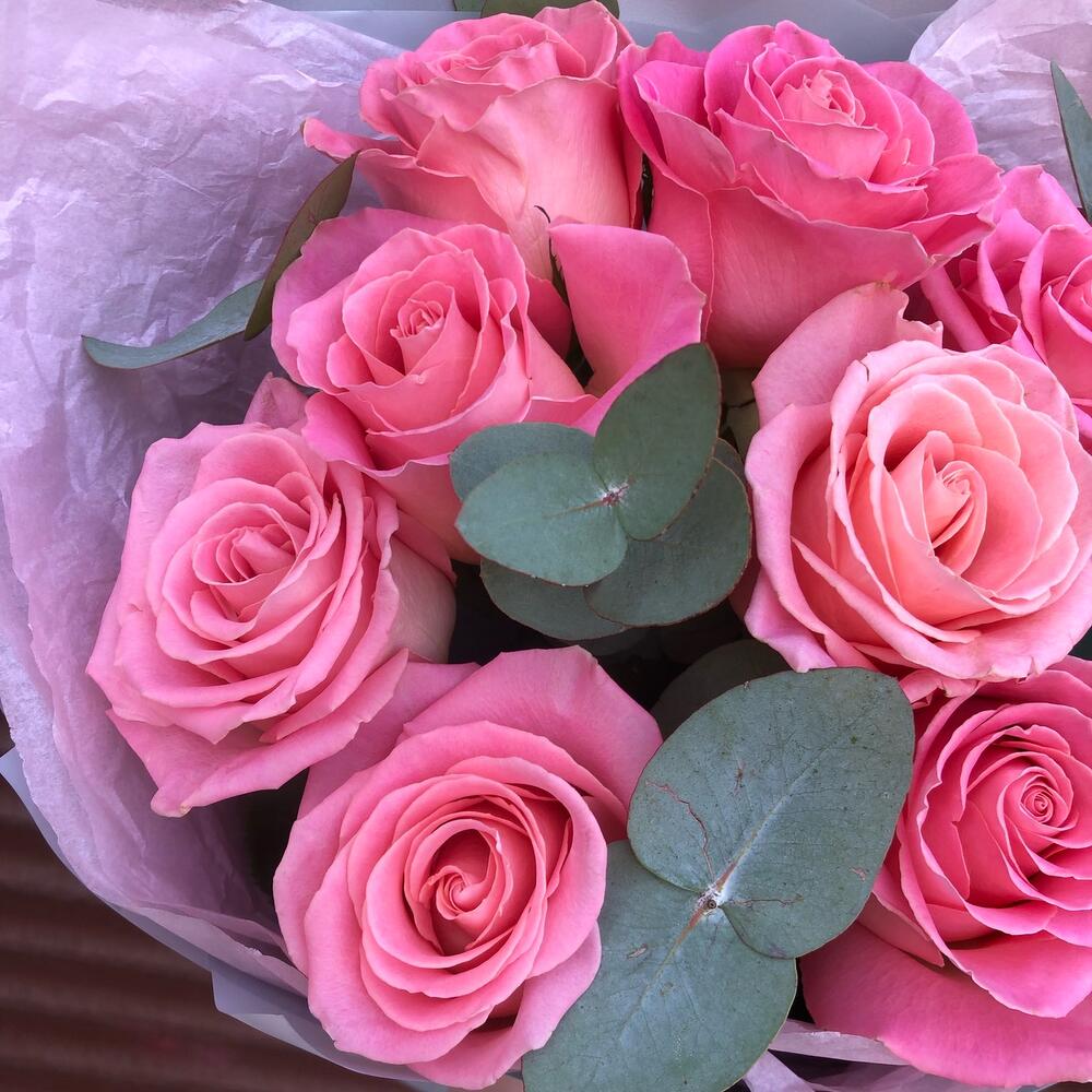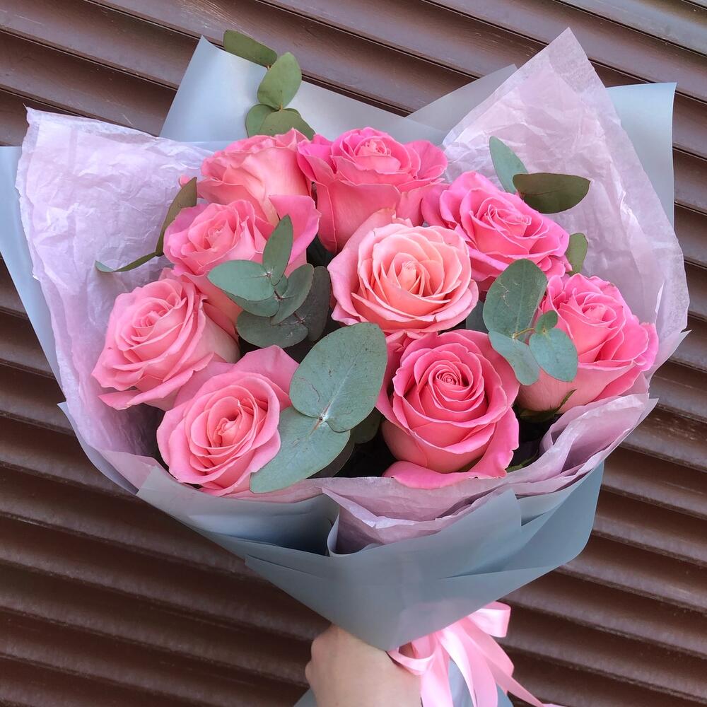 Эвкалипт – 4 шт.Лента атласная – 2 шт.Тишью – 2 шт.роза Hermosa – 9 шт.Пленка матовая – 4 шт.