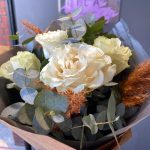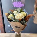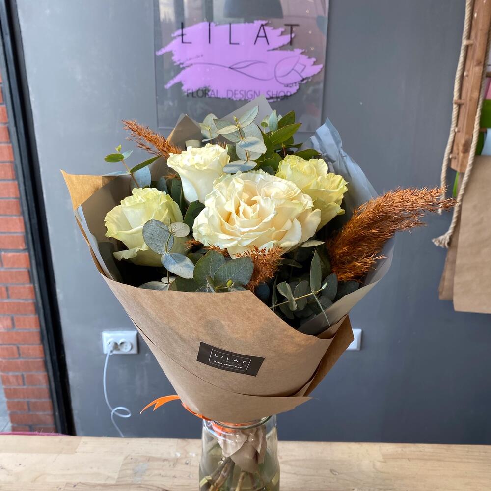 Эвкалипт – 3 шт. Крафт упаковка – 2 шт. Открыточка с вашими пожеланиями – 1 шт. розы – 5 шт.