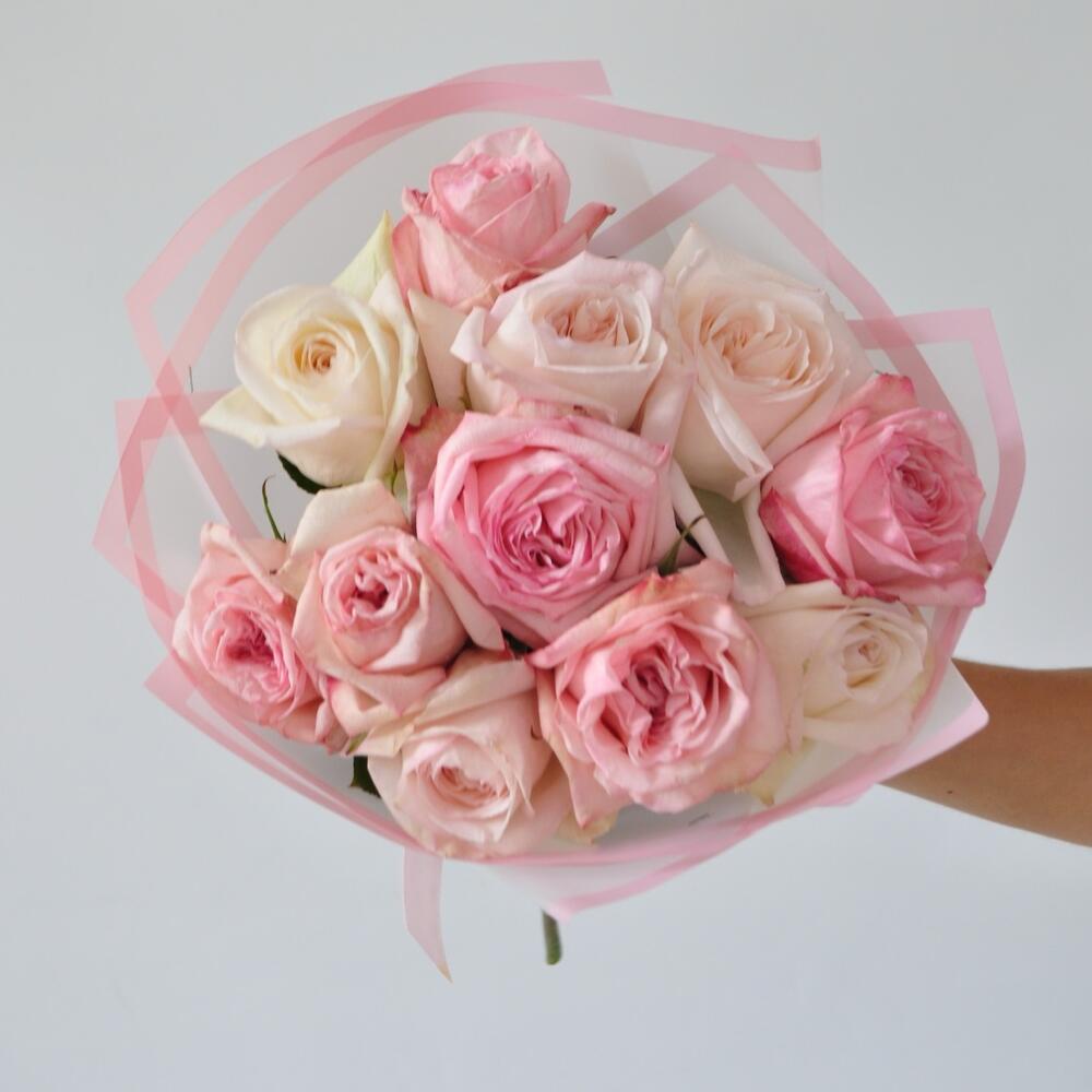 пионовидные розы охара – 11 шт.Пленка матовая – 1 шт.Лента атласная – 1 шт.