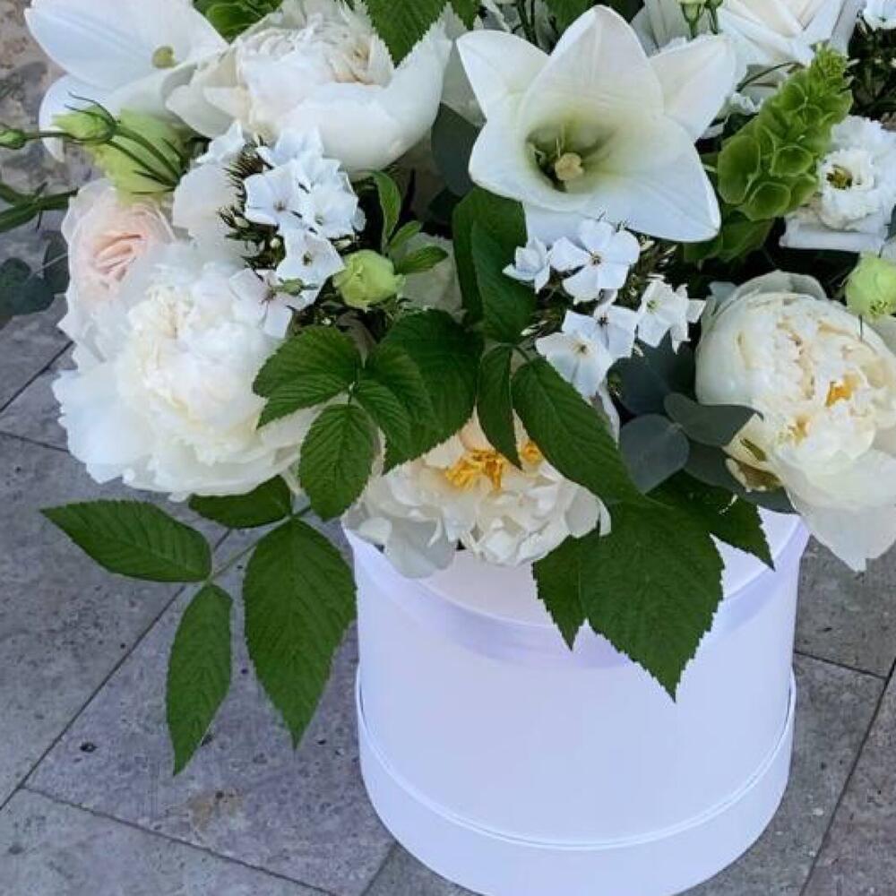 Композиция в шляпной коробке с лилиями, ирландскими колокольчиками, эвкалиптом, пионовидными розами и флоксами.