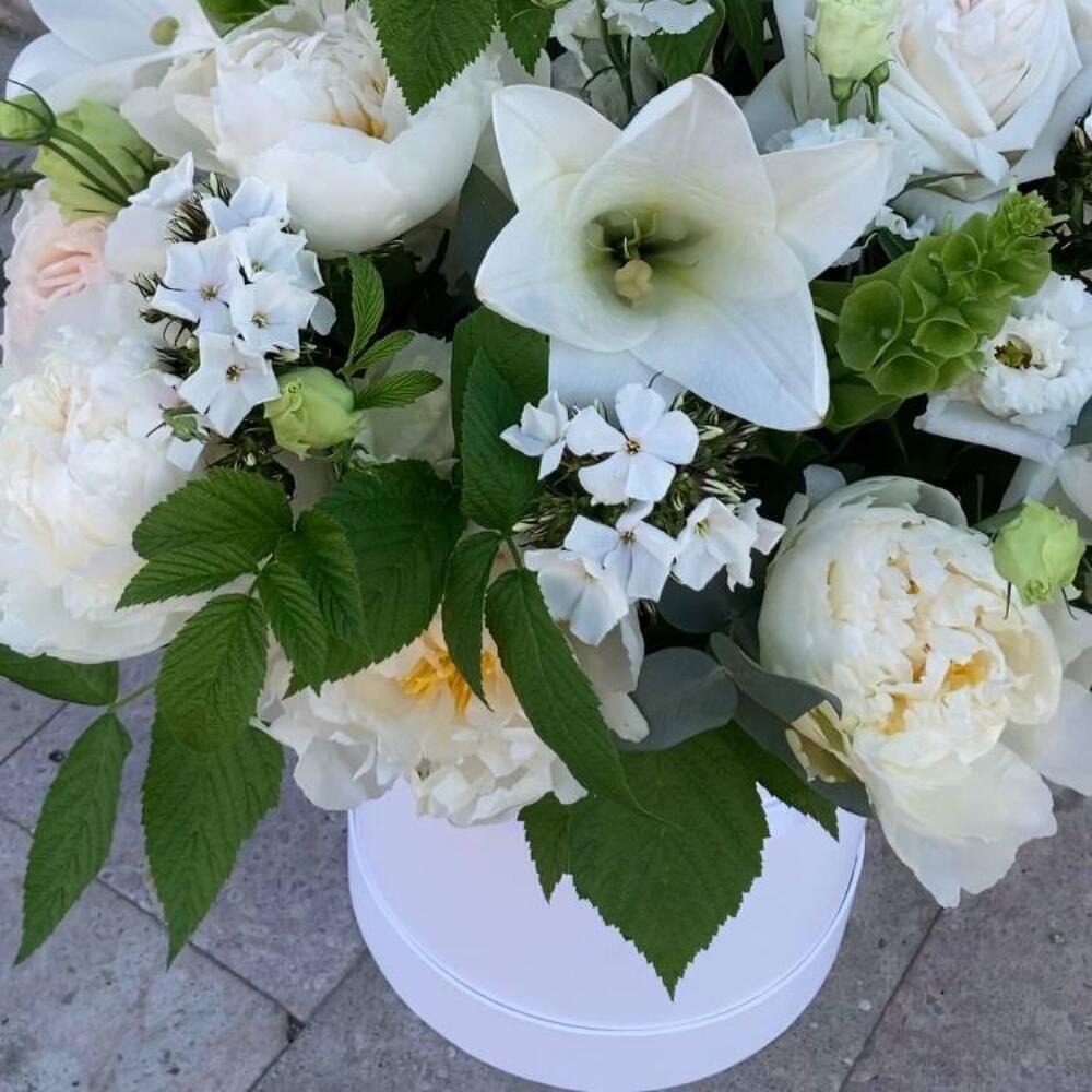 лилия лонг – 3 шт.ирландский колокольчик – 5 шт.Роза пионовидная – 5 шт.Флокс – 5 шт.Лизиантус – 7 шт.Ветки малины – 5 шт.Маттиола – 7 шт.Эвкалипт – 5 шт.Пион – 7 шт.Коробка шляпная – 1 шт.Оазис флористический – 2 шт.