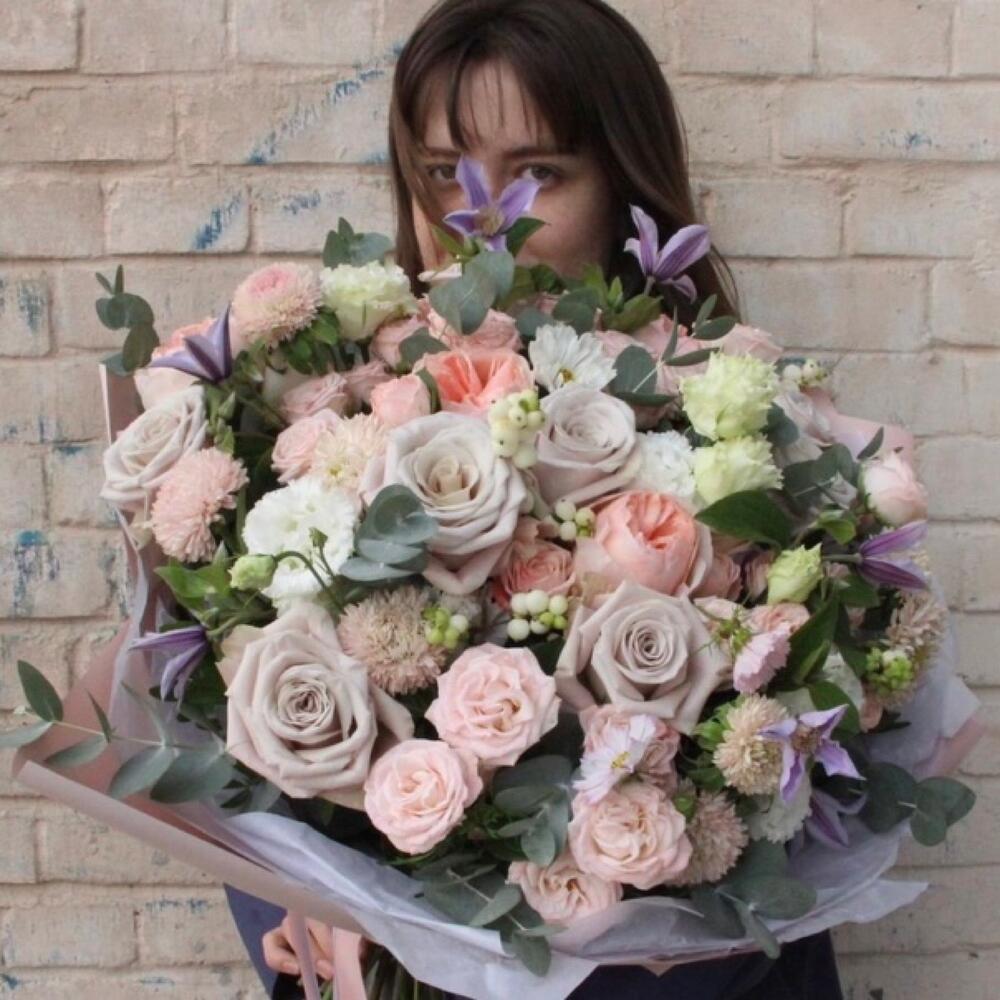 Садовый букет с пионовидными розами, эустомой, клематисом и эвкалиптом.Букет приедет в подарочной коробке, с рекомендациями по уходу за цветами.При необходимости, если букет с нежными цветами или ему предстоит весомое время в дороге – то цветы мы отравляем на воде, останется лишь аккуратно снять кулёчек с водой и поставить букет в подходящую вазу.К каждому букету мы подписываем открытку с вашим посланием – эта услуга, так же в подарок.