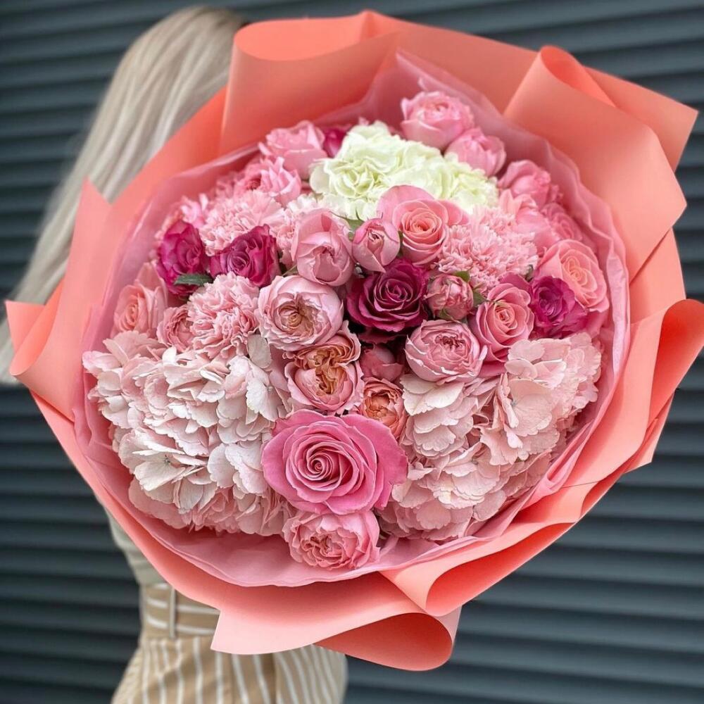 Альстромерии, Гвоздики, Кустовые розы, Лизиантусы, Розы, Хризантемы