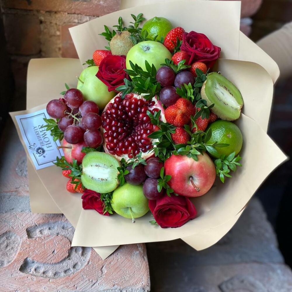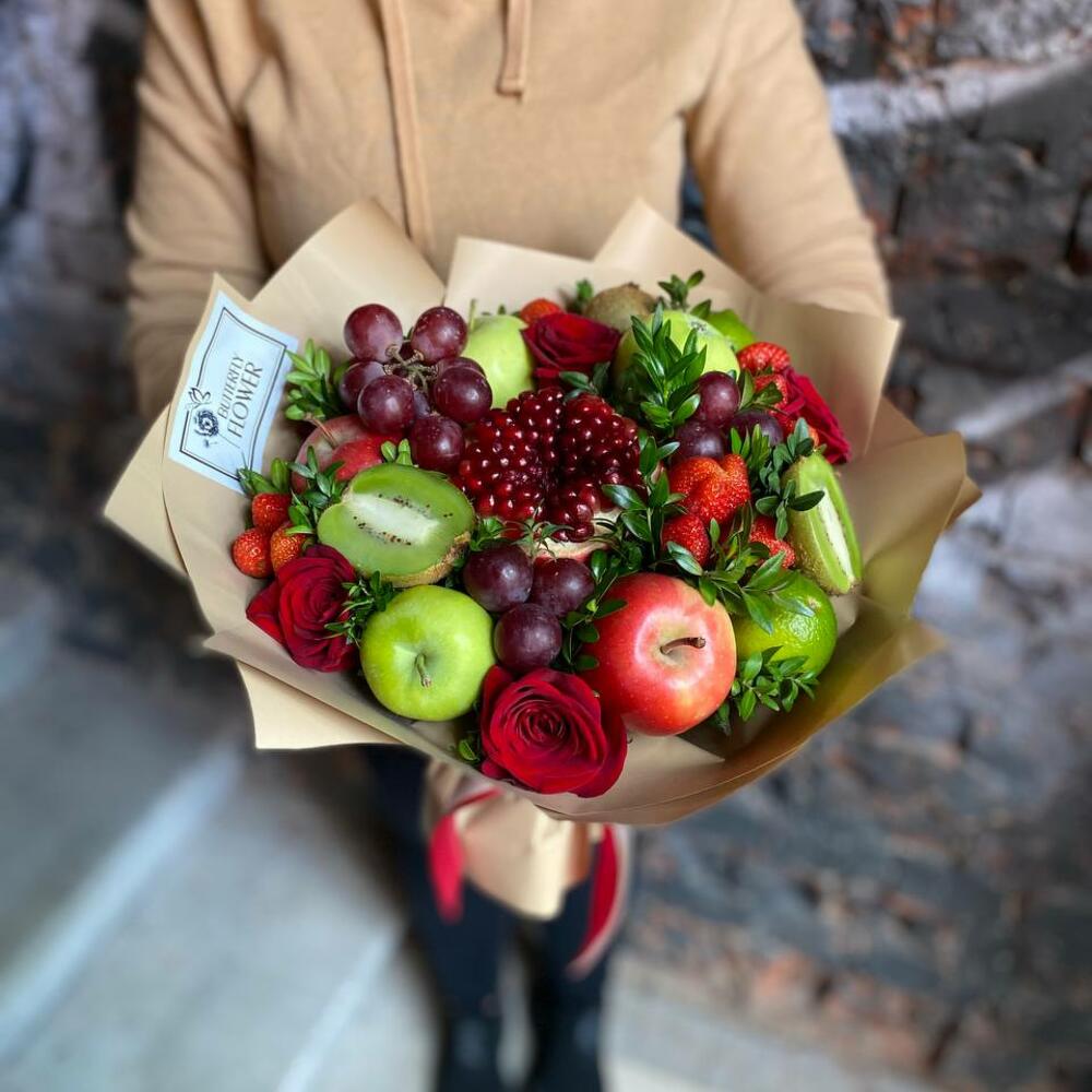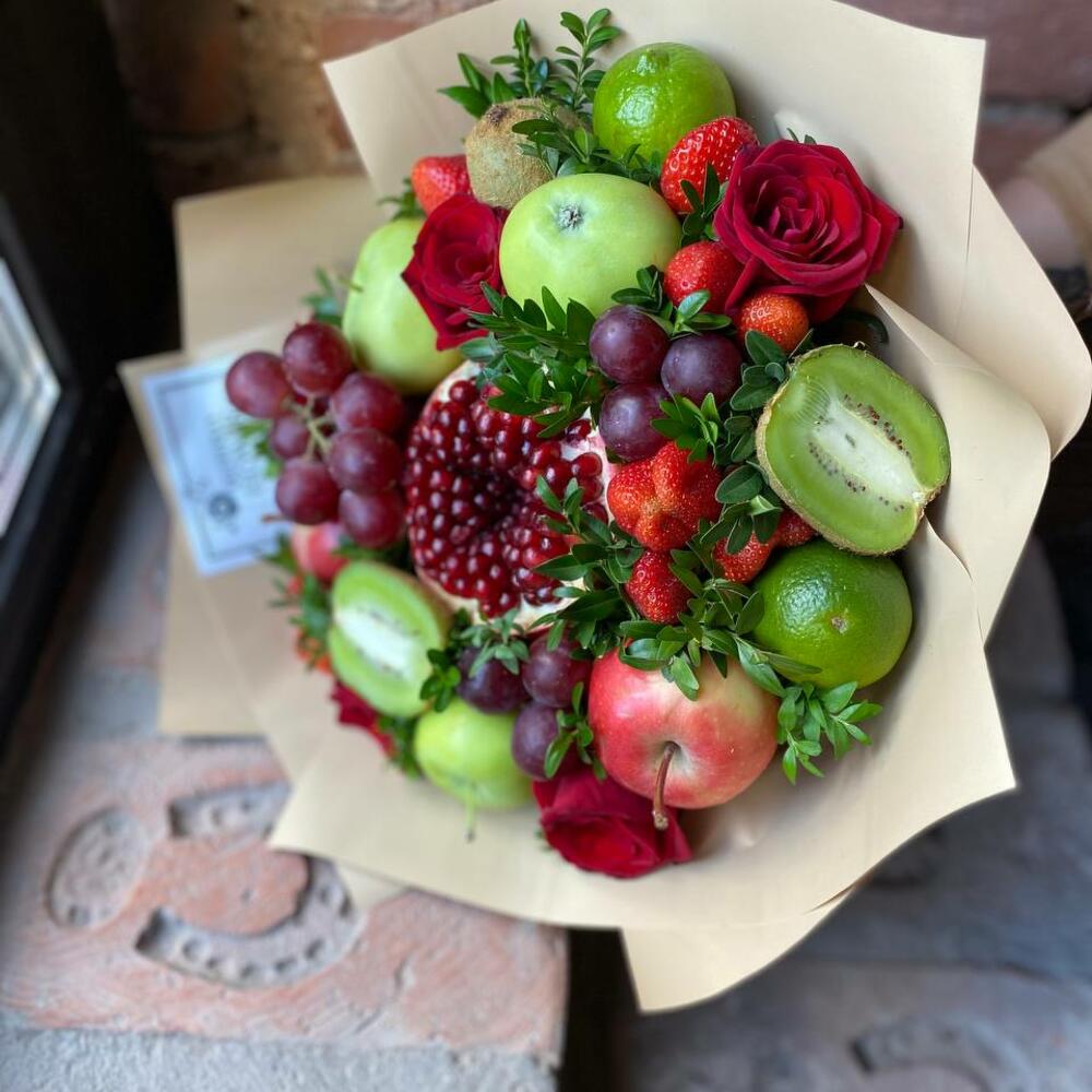Насыщенный яркий букет из свежих цветов и фруктов премиум-качества, это настоящая находка для тех, кто хочет сделать праздник незабываемым