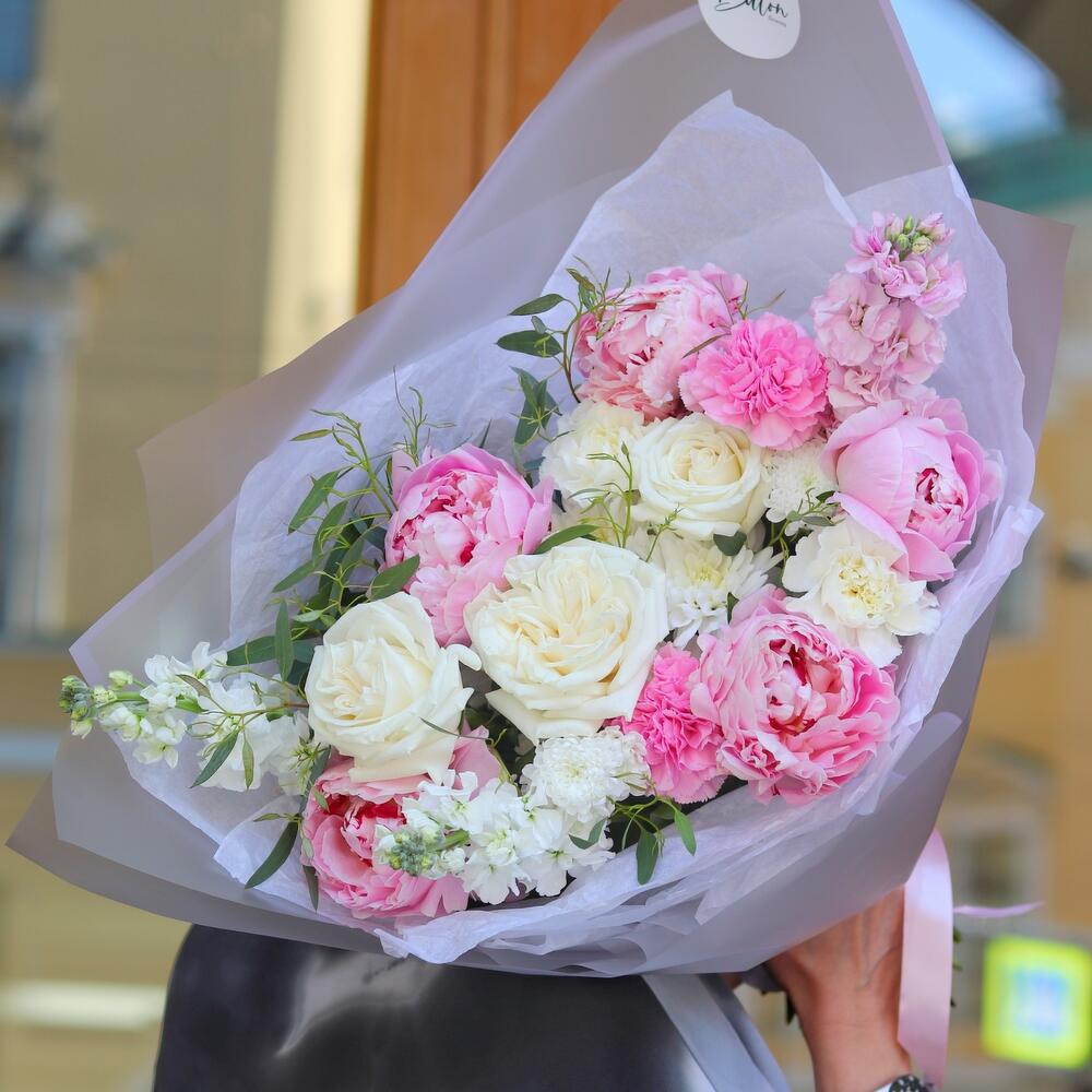 Нежный, чувственный и воздушный букет, выполненный из пионов, роз, хризантемы и ароматной маттиолы.Такой букет точно понравится яркой и энергичной получательнице, и будет долго радовать её.К букету прилагается открытка с вашими пожеланиями, инструкцию по уходу за цветами и приятный комплимент от нашего магазина – шоколадка. Мы также будем рады отправить вместе с букетом конфеты, шоколад ручной работы или б/а вино по вашим пожеланиям, просто напишите нам в личные сообщения. Заказывая наш букет, Вы всегда получите исключительный сервис и заботу о клиенте