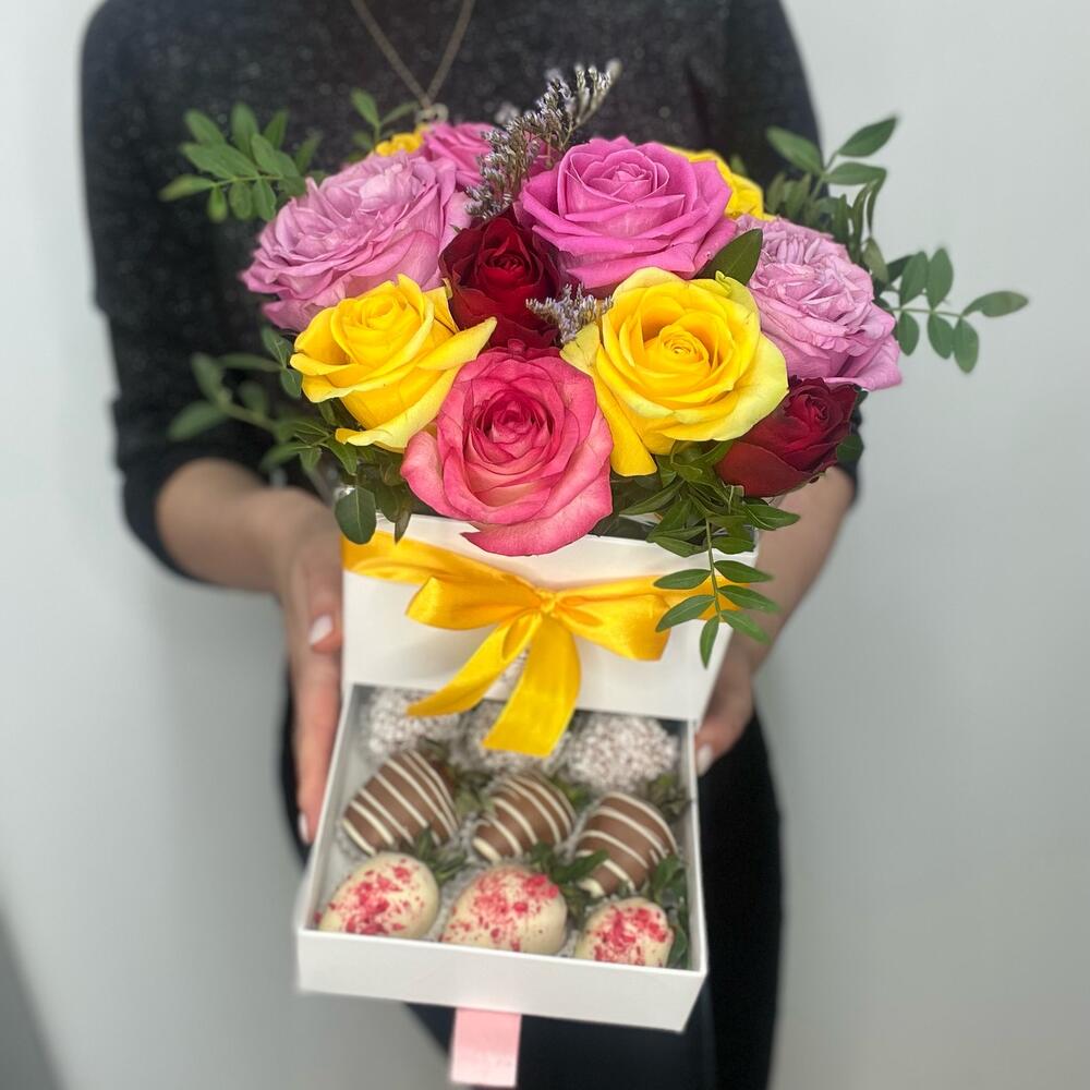 Шкатулка с цветами и клубникой в шоколаде «Розы микс»