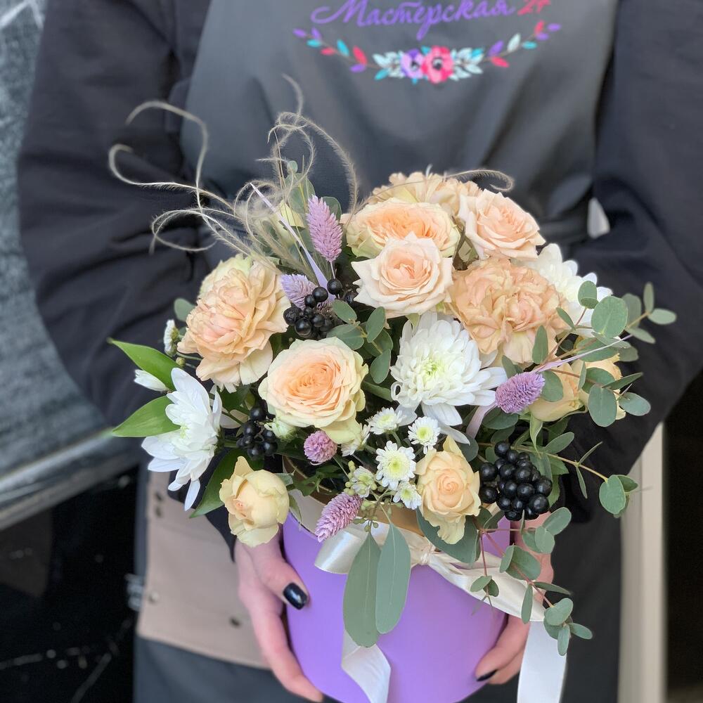 Коробочка в приятной цветовой гамме из кустовой розы, кустовой Хризантемы, гвоздички, с добавлением ягодок, эвкалипта и сухоцветов, в лице стифы и фалариса.