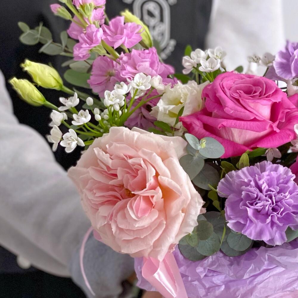 Шляпная коробка с яркими розовыми и фиолетовыми цветами, в центре которой находится великолепная Пионовидная Роза сорта Цумуги – по-настоящему Королева всех цветов. Яркая гамма, приятный аромат этой композиции с маттиолой, фиолетовыми гвоздиками, лизиантусом придется по … Показать ещёвкусу как юной девушке, там и женщине со статусом.