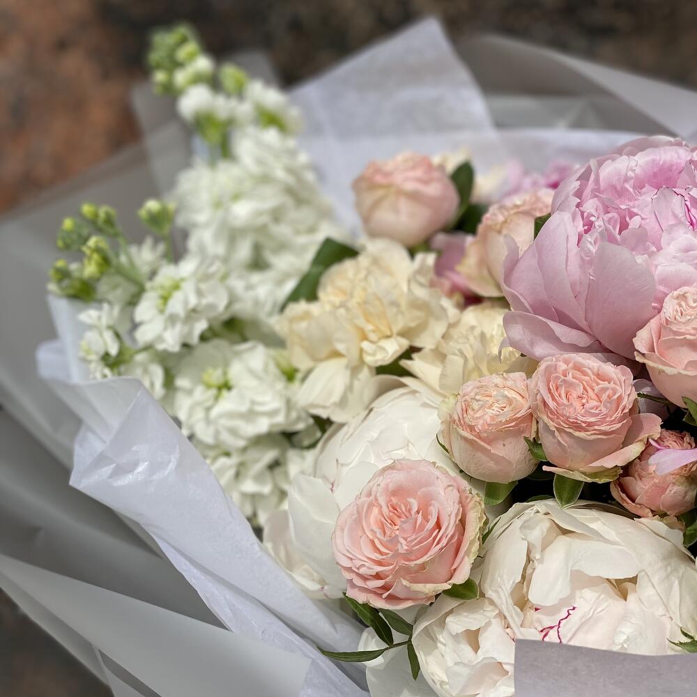 Потрясающий букет из идеального состава: крупные пионы, ароматная маттиола, кустовая пионовидная роза! Букет одновременно нежный и торжественный!