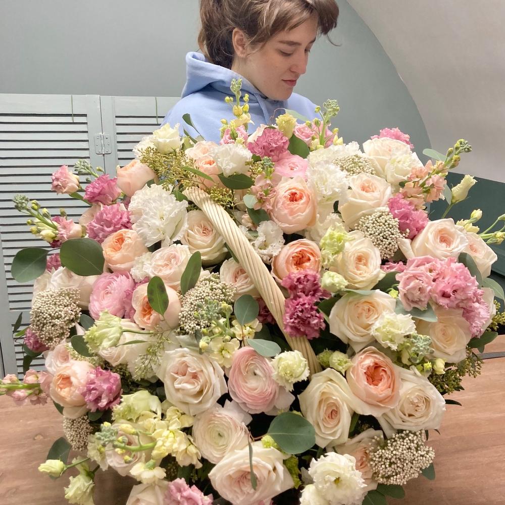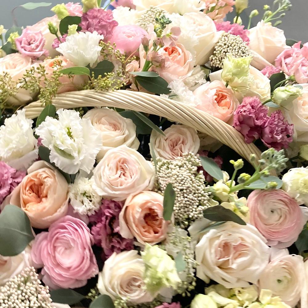 Роскошная корзина с ранункулюсами, английскими пионовидными розами, душистой маттиолой, озотамнусом, пионами, лизиантусом и эвкалиптом.