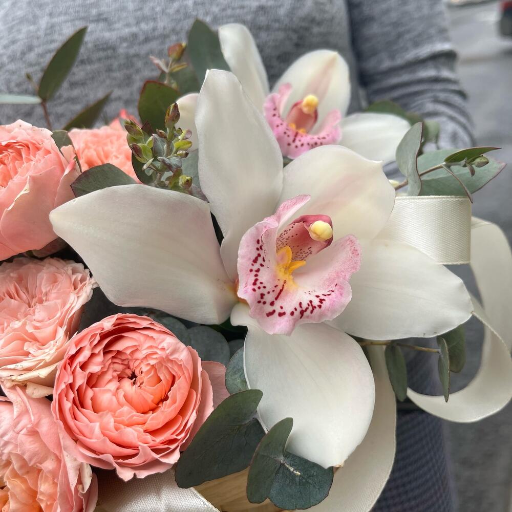 роза премиум пионовидные джульетта нежно-розовая – 4 шт.Эвкалипт – 3 шт.удлинитель для орхидеи – 2 шт.Орхидея Цимбидиум белая – 2 шт.Корзина плетеная – 1 шт.Оазис флористический – 1 шт.Лента атласная – 1 шт.