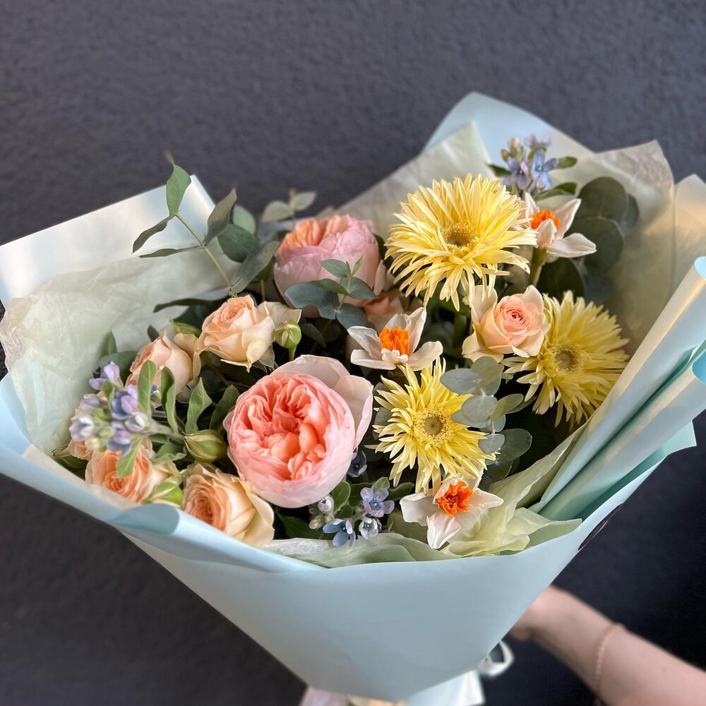 Гербера – 3 шт.Оксипеталум – 3 шт.Нарцисс – 3 шт.Кустовая роза – 2 шт.Пионовидная роза – 2 шт.Эвкалипт – 5 шт.декоративная упаковка – 1 шт.Атласная лента – 1 шт.