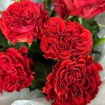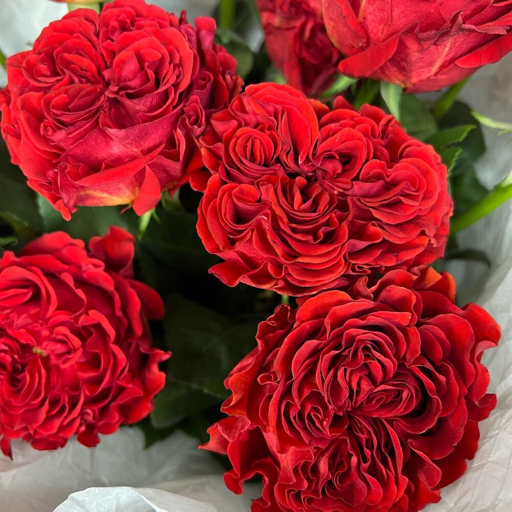 Вывернутые бархатные алые розы в белоснежной упаковке