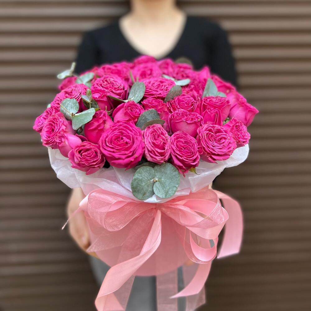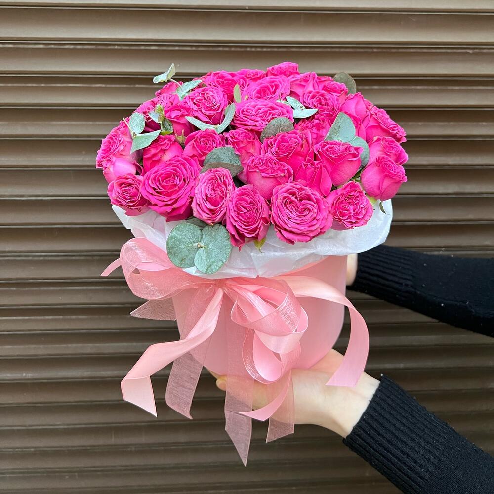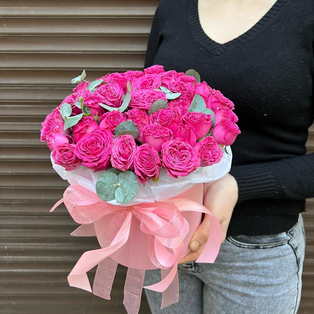 Цветы в коробке кустовые пионовидных розы с эвкалиптом