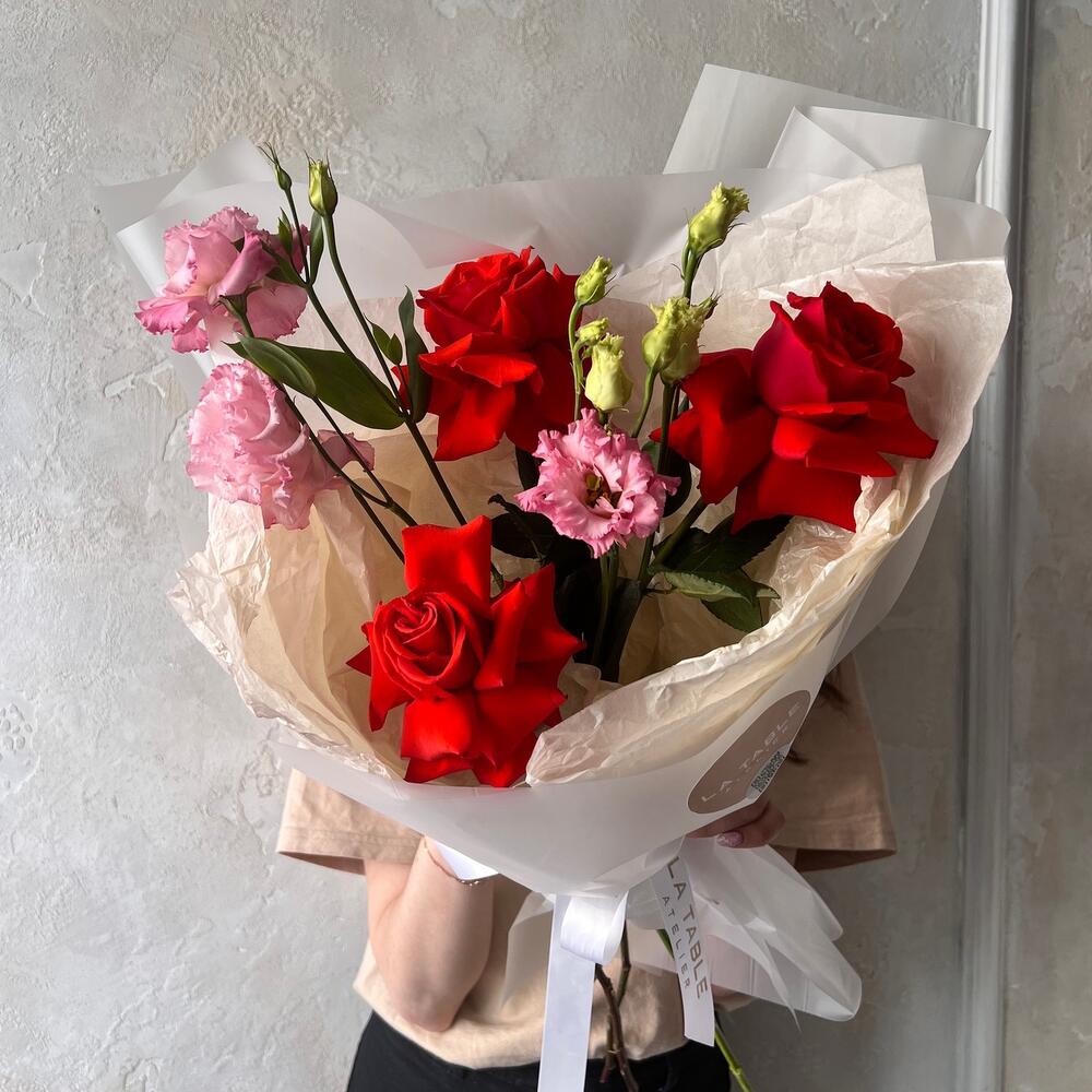 Яркий букет с французскими розами и махровым лизиантусом