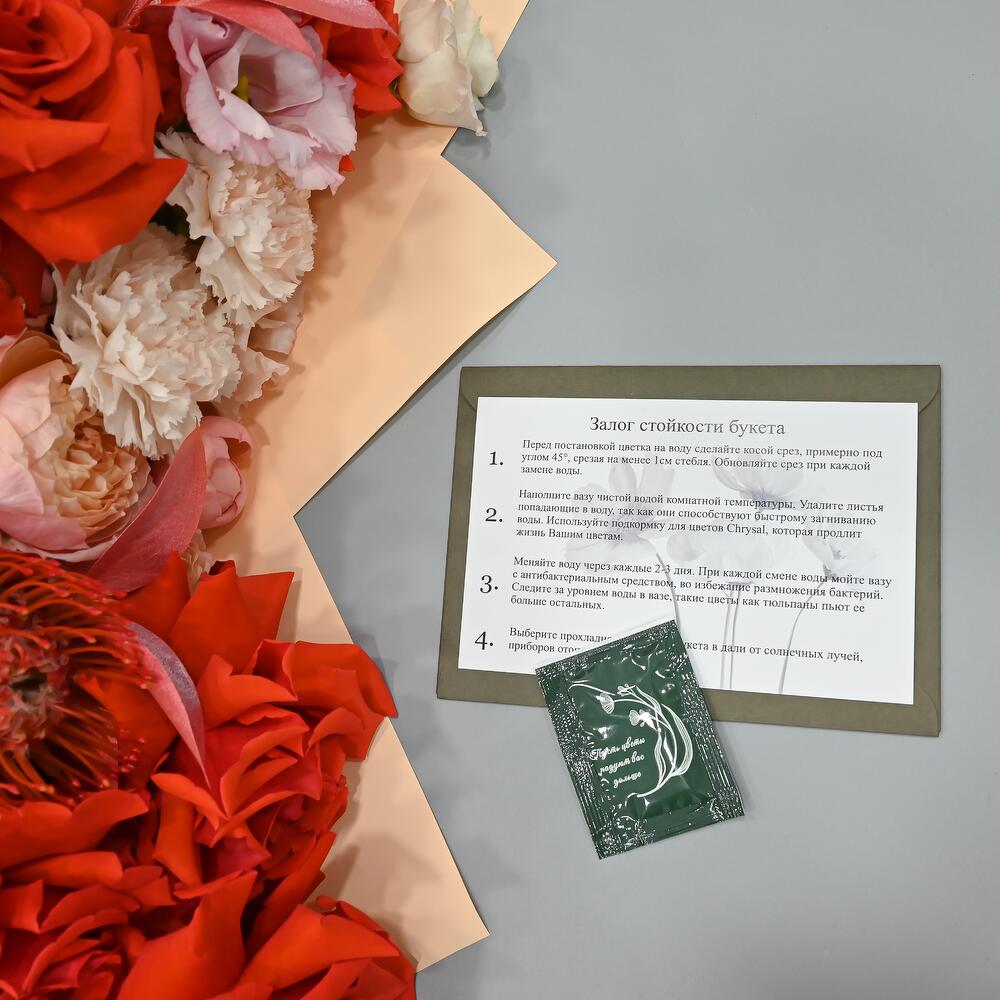 Яркий букет в красно персиковой цветовой гамме. В составе французские розы, пионовидная кустовая роза, гвоздика, леукоспермум и лизиантус.Флористы студии Цветочный Этикет собрали его из самых свежих цветов, тщательно продумав состав. Букет готов удивлять красотой своего … Показать ещёполучателя! Станет идеальным подарком для любимой женщины, дочке или мамы, на День Рождения, юбилей, свадьбу и другие торжественные мероприятия. С букетом вы получите конверт с открыткой, в которой мы напишем любое пожелание, инструкцию свежести и средство для продления жизни срезанных цветов.