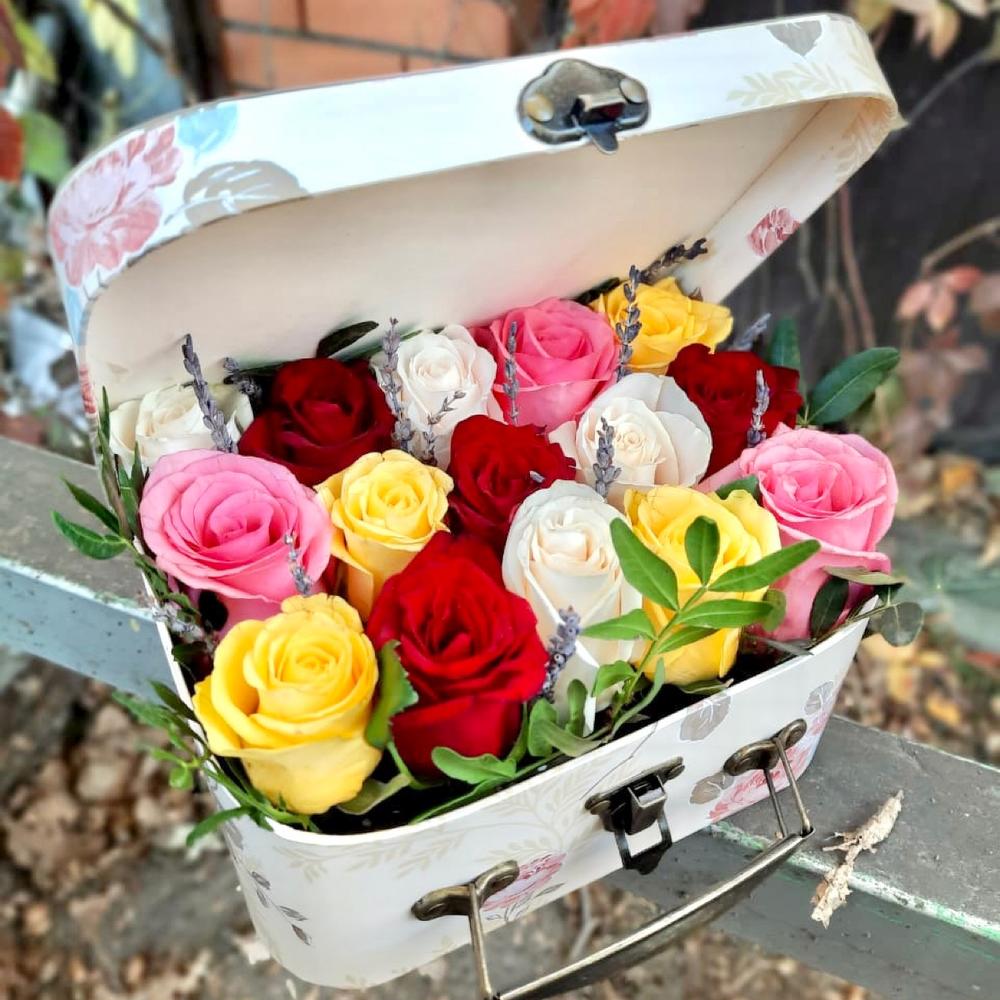 Чудесный, яркий чемоданчик из разноцветных роз, с добавлением голландской зелени и ароматной лавандой.