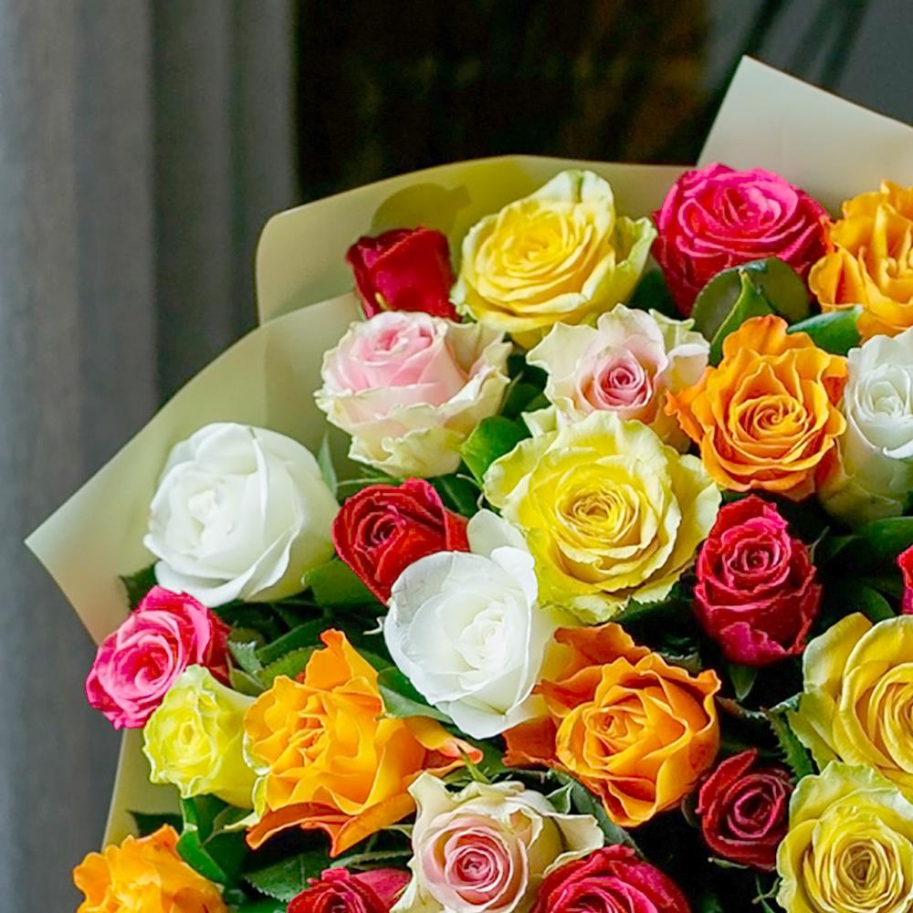 Яркий микс кенийских розочек в стильном монобукете. Такой букет подойдёт для любого повода: День Рождения, именины, годовщина свадьбы, рождение ребенка, 8 марта, День Святого Валентина, выпускной и т.д. Можно вручить маме, сестре, подруге, коллеге, любимой.