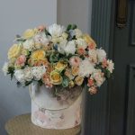 Роза сортовая – 11 шт.Роза кустовая – 7 шт.Пион – 7 шт.Гвоздика одноголовая – 9 шт.Гвоздика кустовая розовая – 5 шт.Эвкалипт – 5 шт.Питтоспорум илан – 5 шт.Коробка шляпная – 1 шт.