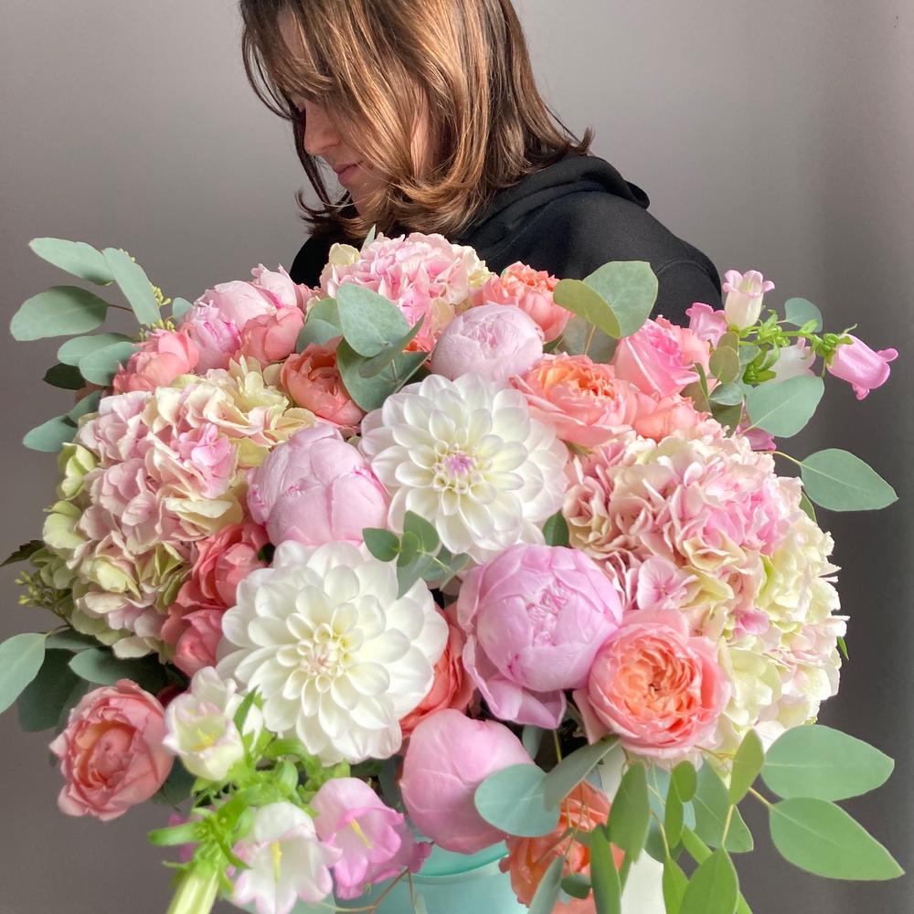 Жемчуга – Шляпная коробка с пионами, гортензиями и пионовидными розами