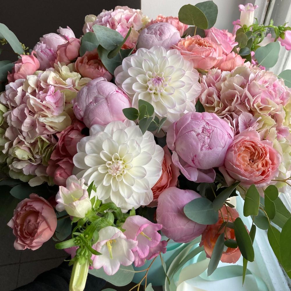 Гортензия – 3 шт.Роза кустовая пионовидная – 7 шт.Пион – 5 шт.Колокольчик – 5 шт.Георгина – 3 шт.Эвкалипт – 5 шт.Шляпная коробка – 1 шт.Лента атласная – 2 шт.Тишью – 2 шт.Оазис флористический – 2 шт.