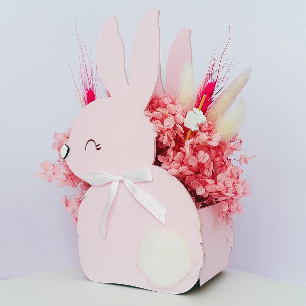 декоративные элементы – 3 шт.упаковка дизайнерская пленка – 1 шт.лагурус (сухоцвет) белый – 3 шт.лагурус (сухоцвет) сиреневый – 2 шт.гортензия стабилизированная розовая – 1 шт.кашпо деревянное зайчик – 1 шт.пшеница (сухоцвет) фуксия – 2 шт.