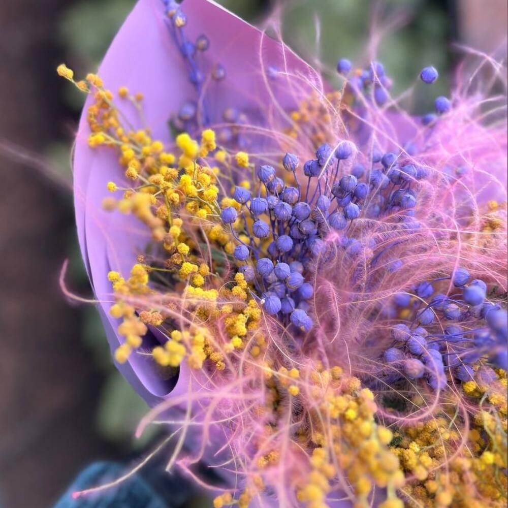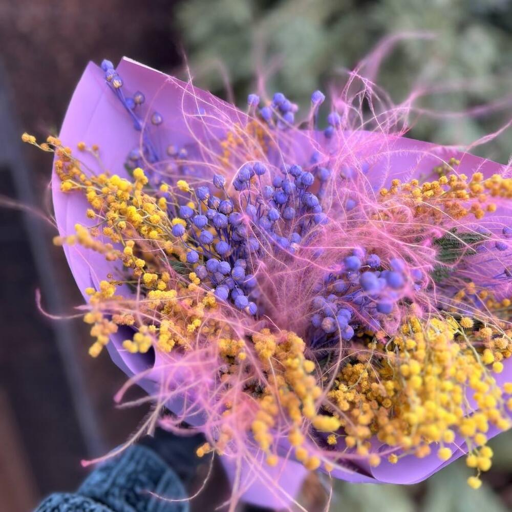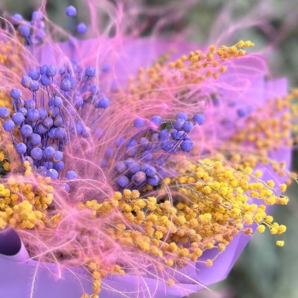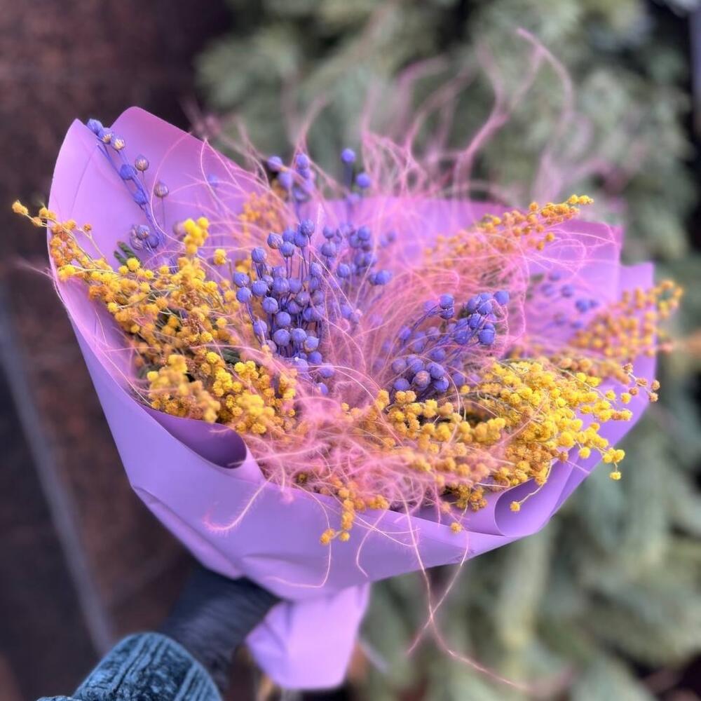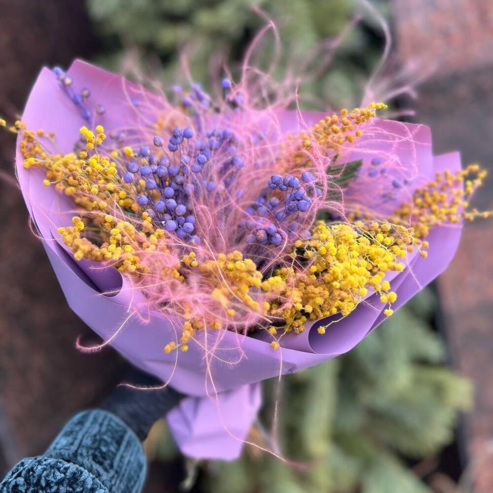 мимоза сухоцвет – 5 шт.лëн сухоцвет – 5 шт.ковыль пучок – 5 шт.Упаковка дизайнерская – 4 шт.Лента атласная – 1 шт.